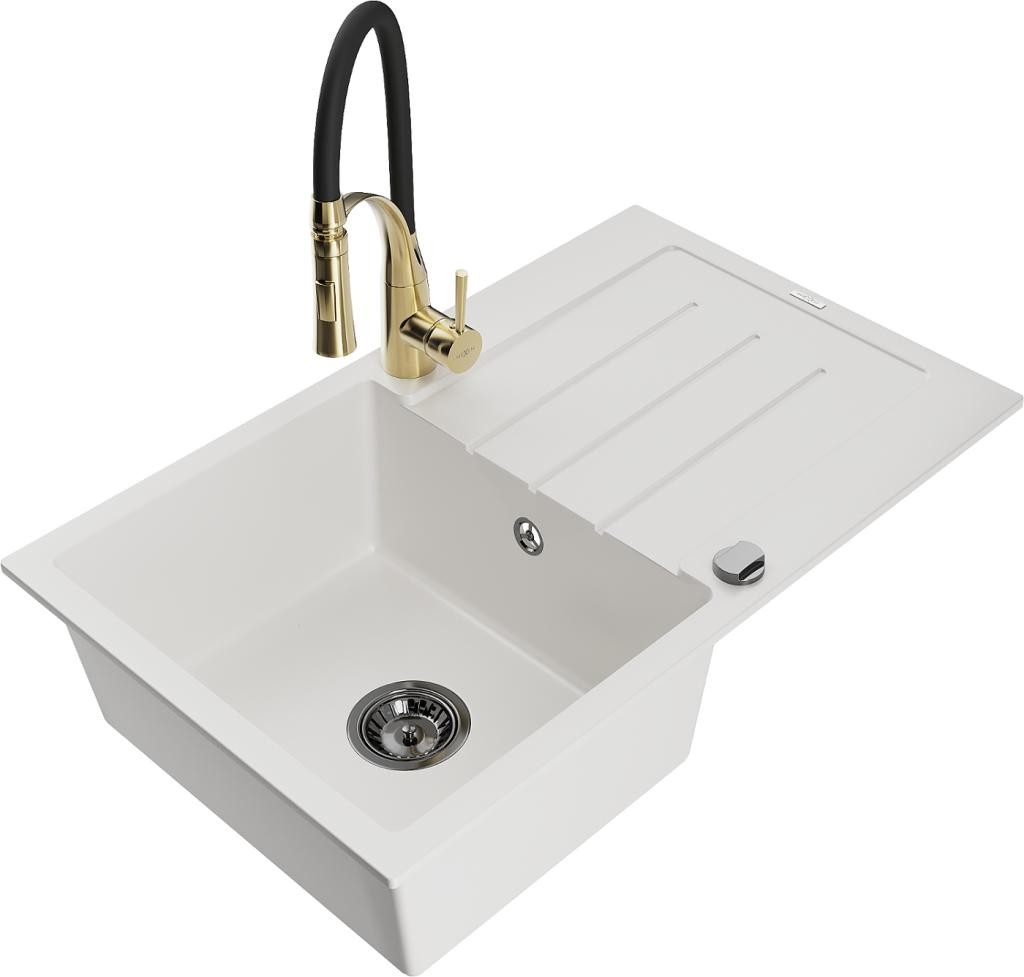MEXEN/S - Cesar granitový dřez 1-miska s odkapávačem včetně baterie Flora, černá/zlatá metalik 6514-75-670401-00