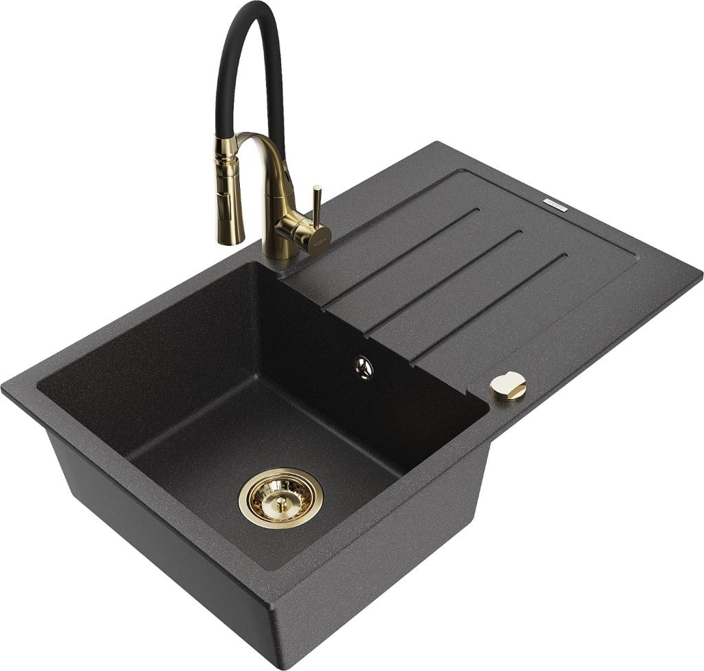 MEXEN/S - Bruno granitový dřez 1 s odkapávačem včetně baterie Flora, černá 6513-77-670401-00