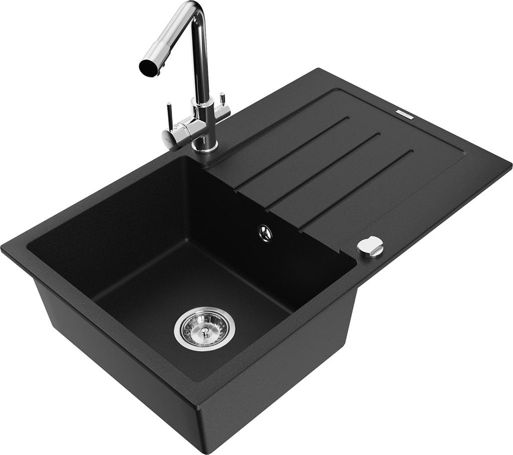 MEXEN/S - Kevin granitový dřez 1 s odkapávačem včetně baterie Savita, černá 6517-77-672601-50
