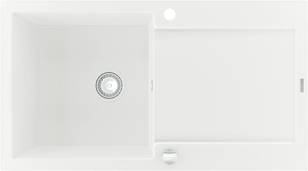 Technická data: Velikost: 900x500x190 mm Hloubka komory: 180 mm Rozměry komory: 430 x 415 mm Průměr odtoku: ø90 mm Typ: 1 miska s odkapávačem Typ: Zapuštěné do desky stolu bílá barva Materiál: žula Přepadový otvor: Ano Závit: Ano Včetně automatického sifonu Vysoká odolnost proti poškrábání a zabarvení Odolnost proti tepelným šokům Snadno čistitelný povrch Dva další vyfrézované otvory pro vlastní děrování ø35