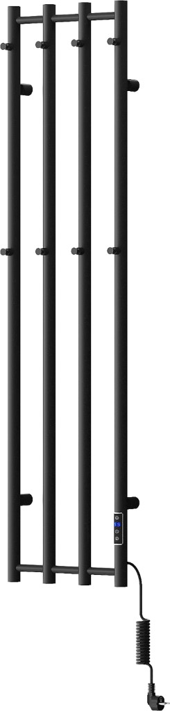 Technická data: Výška: 1405 mm Šířka: 347 mm Hloubka: 42 mm Barva: černá RAL 9005 Materiál: ocel Topný výkon: 250W Počet topných tyčí: 4 Počet věšáků na ručníky: 8 Délka napájecího kabelu: 1,6m Provozní napětí: 230V/50Hz Stupeň krytí: IP24 Dotykové ovládání pomocí LED displeje Vestavěný termostat udržuje požadovanou teplotu radiátoru Má speciální topné těleso, které nevyžaduje připojení k vodovodní instalaci ani nalévání jakékoli kapaliny Vysoce kvalitní, odolný nátěr odolný proti korozi Sada obsahuje: závěsy, montážní sadu a záslepky Funkce radiátoru: - Sensitive umožňuje nastavit teplotu od 30°C do 60°C - Comfort má možnost sušení, která umožňuje nastavit teplotu ohřevu na zvolené hodinové stupnici - Inteligentní možnost nastavení doby provozu ohřívače od 1 do 8 hodin