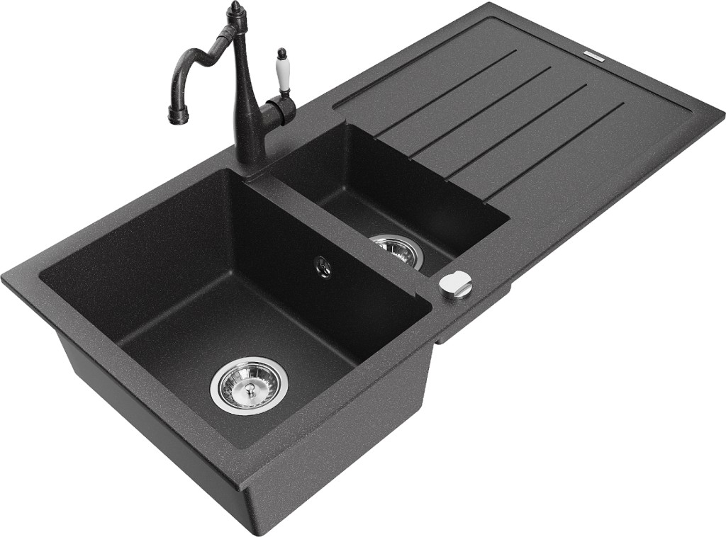 Dřez: Rozměr: 1000x500x200 mm Hloubka komory: 190 mm (větší), 115 mm (menší) Rozměry komory: 430x330 mm (větší), 340x170 mm (menší) Průměr odtoku: ø90 mm Typ: 1,5-miska s odkapávačem Typ: Zapuštěné do pracovní desky Barva: Skvrnitá černá Povrchová úprava sifonu: Chrome Materiál: žula (80% žulové kamenivo 20% pryskyřice) Přepadový otvor: Ano Otvory: (baterie, automat) 2 Instalace: Univerzální, lze instalovat s odkapávačem na levou nebo pravou stranu Vysoká odolnost proti poškrábání a změně barvy Odolnost proti tepelným šokům Povrch pro snadné čištění Dva dodatečné vyfrézované otvory pro samoděrování ø35 Kuchyňská baterie: Materiál: mosaz Barva: Skvrnitá černá Hlava: Keramická Perlátor: Ano Typ: Jednopáková Výška baterie: 290 mm Rozsah výtoku: 260 mm