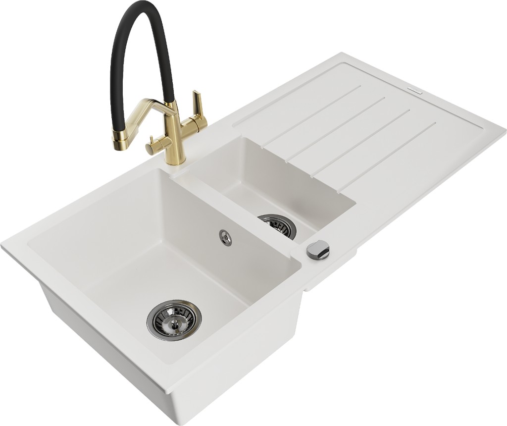 Technické údaje: Kuchyňský dřez: Rozměr: 1000x500x200 mm Hloubka komory: 190 mm (větší), 115 mm (menší) Rozměry komory: 430x330 mm (větší), 340x170 mm (menší) Průměr odtoku: ø90 mm Typ: 1,5-miska s odkapávačem Typ: Zapuštěné do pracovní desky Barva: Bílá Povrchová úprava sifonu: černá Materiál: žula (80% žulové kamenivo 20% pryskyřice) Přepadový otvor: Ano Otvory: (baterie, automat) 2 Instalace: Univerzální, lze instalovat s odkapávačem na levou nebo pravou stranu Vysoká odolnost proti poškrábání a změně barvy Odolnost proti tepelným šokům Povrch pro snadné čištění Dva dodatečné vyfrézované otvory pro samoděrování ø35 Kuchyňská baterie: Materiál: mosaz Barva: Zlatá/Černá Hlavy: Keramické Perlátor: Ano Typ výtoku: Flexibilní s mosaznou podpěrou Rozsah výtoku: 260 mm Výška: 405 mm Typ: Dvě rukojeti Dvouhlavá baterie s přídavným filtrem na pitnou vodu