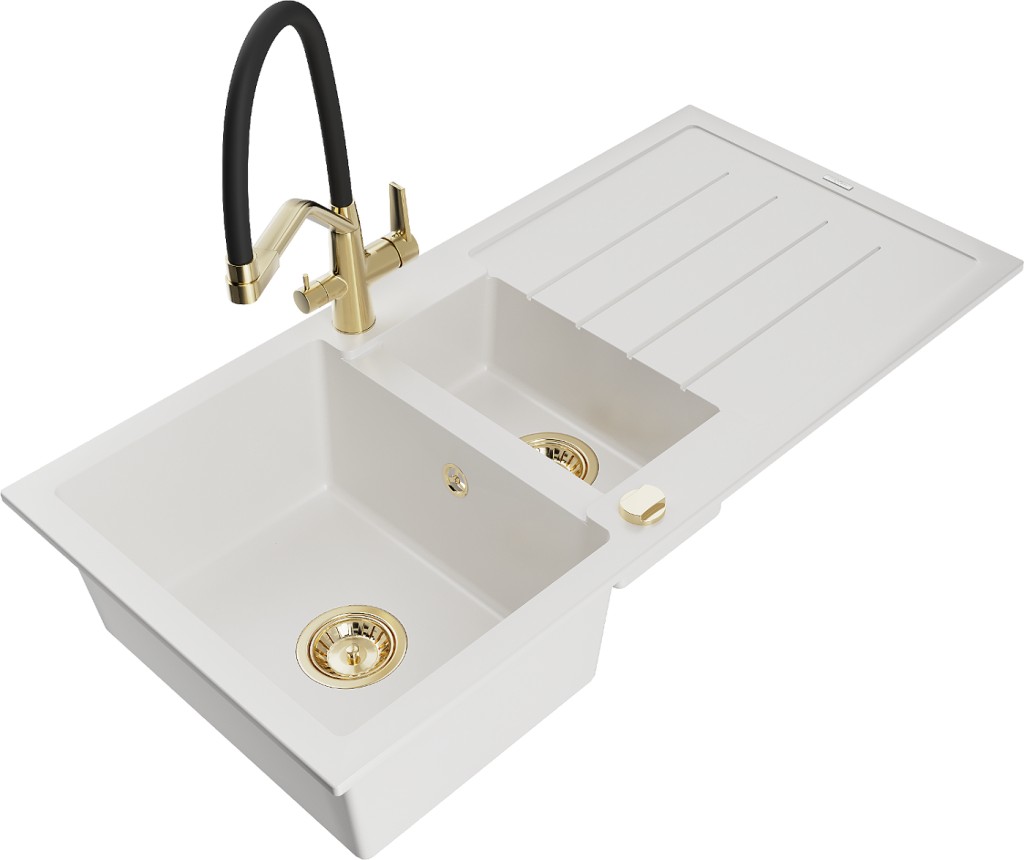 Technické údaje: Kuchyňský dřez: Rozměr: 1000x500x200 mm Hloubka komory: 190 mm (větší), 115 mm (menší) Rozměry komory: 430x330 mm (větší), 340x170 mm (menší) Průměr odtoku: ø90 mm Typ: 1,5-miska s odkapávačem Typ: Zapuštěné do pracovní desky Barva: Bílá Povrchová úprava sifonu: zlatá Materiál: žula (80% žulové kamenivo 20% pryskyřice) Přepadový otvor: Ano Otvory: (baterie, automat) 2 Instalace: Univerzální, lze instalovat s odkapávačem na levou nebo pravou stranu Vysoká odolnost proti poškrábání a změně barvy Odolnost proti tepelným šokům Povrch pro snadné čištění Dva dodatečné vyfrézované otvory pro samoděrování ø35 Kuchyňská baterie: Materiál: mosaz Barva: Zlatá/Černá Hlavy: Keramické Perlátor: Ano Typ výtoku: Flexibilní s mosazným držákem Rozsah výtoku: 260 mm Výška: 405 mm Typ: Dvě rukojeti Dvouhlavá baterie s přídavným filtrem na pitnou vodu