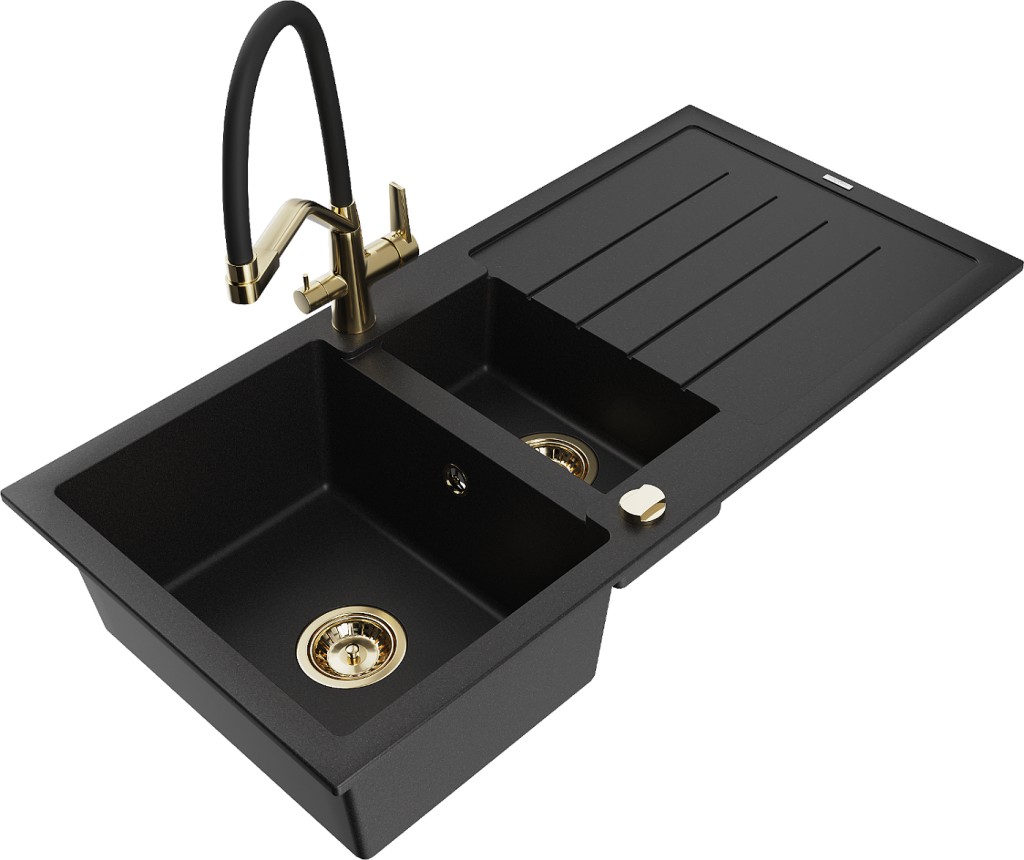 Technická data: Dřez: Rozměr: 1000x500x200 mm Hloubka komory: 190 mm (větší), 115 mm (menší) Rozměry komory: 430x330 mm (větší), 340x170 mm (menší) Průměr odtoku: ø90 mm Typ: 1,5-miska s odkapávačem Typ: Zapuštěné do pracovní desky Černá barva Povrchová úprava sifonu: zlatá Materiál: žula (80% žulové kamenivo 20% pryskyřice) Přepadový otvor: Ano Otvory: (baterie, automat) 2 Instalace: Univerzální, lze instalovat s odkapávačem na levou nebo pravou stranu Vysoká odolnost proti poškrábání a změně barvy Odolnost proti tepelným šokům Povrch pro snadné čištění Dva dodatečné vyfrézované otvory pro samoděrování ø35 Kuchyňská baterie: Materiál: mosaz Barva: Zlatá/Černá Hlavy: Keramické Perlátor: Ano Typ výtoku: Flexibilní s mosazným držákem Rozsah výtoku: 260 mm Výška: 405 mm Typ: Dvě rukojeti Dvouhlavá baterie s přídavným filtrem na pitnou vodu