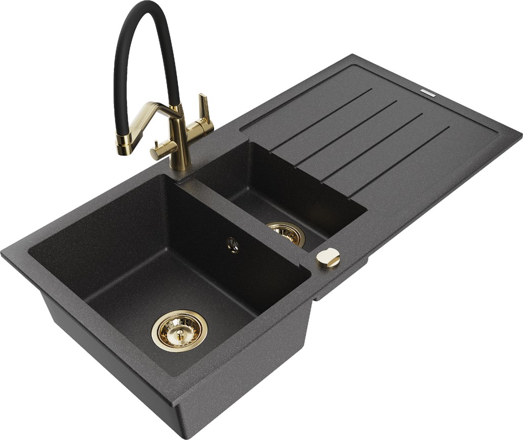 Technická data: Dřez: Rozměr: 1000x500x200 mm Hloubka komory: 190 mm (větší), 115 mm (menší) Rozměry komory: 430x330 mm (větší), 340x170 mm (menší) Průměr odtoku: ø90 mm Typ: 1,5-miska s odkapávačem Typ: Zapuštěné do pracovní desky Barva: Skvrnitá černá Povrchová úprava sifonu: zlatá Materiál: žula (80% žulové kamenivo 20% pryskyřice) Přepadový otvor: Ano Otvory: (baterie, automat) 2 Instalace: Univerzální, lze instalovat s odkapávačem na levou nebo pravou stranu Vysoká odolnost proti poškrábání a změně barvy Odolnost proti tepelným šokům Povrch pro snadné čištění Dva dodatečné vyfrézované otvory pro samoděrování ø35 Kuchyňská baterie: Materiál: mosaz Barva: Zlatá/Černá Hlavy: Keramické Perlátor: Ano Typ výtoku: Flexibilní s mosazným držákem Rozsah výtoku: 260 mm Výška: 405 mm Typ: Dvě rukojeti Dvouhlavá baterie s přídavným filtrem na pitnou vodu