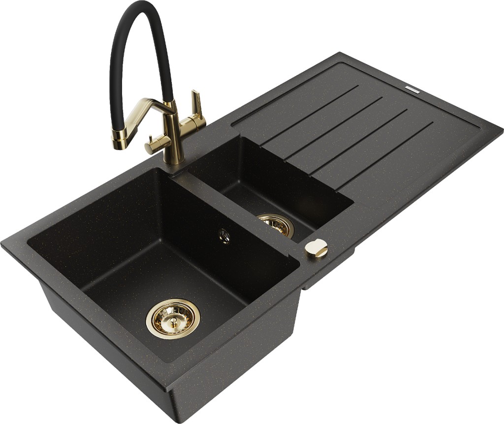 Technická data: Dřez: Rozměr: 1000x500x200 mm Hloubka komory: 190 mm (větší), 115 mm (menší) Rozměry komory: 430x330 mm (větší), 340x170 mm (menší) Průměr odtoku: ø90 mm Typ: 1,5-miska s odkapávačem Typ: Zapuštěné do pracovní desky Barva: černá/zlatá metalíza Povrchová úprava sifonu: zlatá Materiál: žula (80% žulové kamenivo 20% pryskyřice) Přepadový otvor: Ano Otvory: (baterie, automat) 2 Instalace: Univerzální, lze instalovat s odkapávačem na levou nebo pravou stranu Vysoká odolnost proti poškrábání a změně barvy Odolnost proti tepelným šokům Povrch pro snadné čištění Dva dodatečné vyfrézované otvory pro samoděrování ø35 Kuchyňská baterie: Materiál: mosaz Barva: Zlatá/Černá Hlavy: Keramické Perlátor: Ano Typ výtoku: Flexibilní s mosaznou podpěrou Rozsah výtoku: 260 mm Výška: 405 mm Typ: Dvě rukojeti Dvouhlavá baterie s přídavným filtrem na pitnou vodu