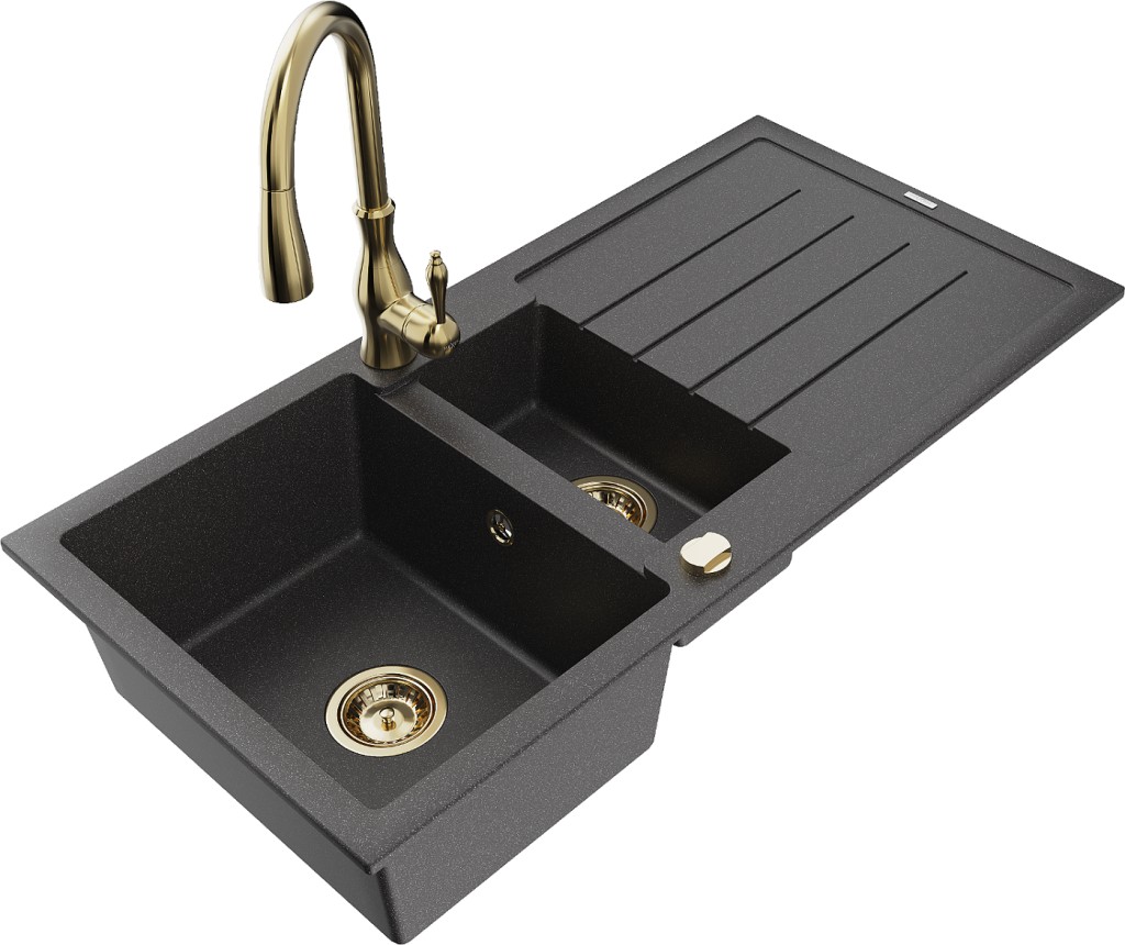 Technická data: Dřez: Rozměr: 1000x500x200 mm Hloubka komory: 190 mm (větší), 115 mm (menší) Rozměry komory: 430x330 mm (větší), 340x170 mm (menší) Průměr odtoku: ø90 mm Typ: 1,5-miska s odkapávačem Typ: Zapuštěné do pracovní desky Barva: Skvrnitá černá Povrchová úprava sifonu: zlatá Materiál: žula (80% žulové kamenivo 20% pryskyřice) Přepadový otvor: Ano Otvory: (baterie, automat) 2 Instalace: Univerzální, lze instalovat s odkapávačem na levou nebo pravou stranu Vysoká odolnost proti poškrábání a změně barvy Odolnost proti tepelným šokům Povrch pro snadné čištění Dva dodatečné vyfrézované otvory pro samoděrování ø35 Kuchyňská baterie: Materiál: mosaz Barva: Zlatá Hlava: Keramická Perlátor: Ano Typ: Jednopákové Výška baterie: 410 mm Rozsah výtoku: 231 mm