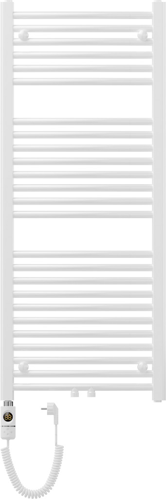 Technická data: Výška: 1200 mm Šířka: 500 mm Hloubka: 52 mm bílá barva Materiál: ocel Topný výkon: 600W Počet topných tyčí: 25 Celková délka ohřívače: 656 mm Délka topného tělesa: 540 mm Délka napájecího kabelu: 1,5m Provozní napětí: 230V/50Hz Stupeň krytí: IP44 Dotykové ovládání pomocí LED displeje Dodatečná ochrana proti chodu na sucho Vestavěný termostat udržuje požadovanou teplotu radiátoru Vysoce kvalitní, odolný nátěr odolný vůči korozi Pro správnou funkci musí být radiátor naplněn vodou nebo směsí vody, např. s glykolem Sada obsahuje: závěsy, montážní sadu a záslepky Funkce radiátoru: - Sensitive umožňuje nastavit teplotu v rozmezí 40°C-65°C - Comfort má možnost sušení, která umožňuje nastavit teplotu ohřevu na zvolené hodinové stupnici - Dětská pojistka umožňuje uzamknout ovladač topení