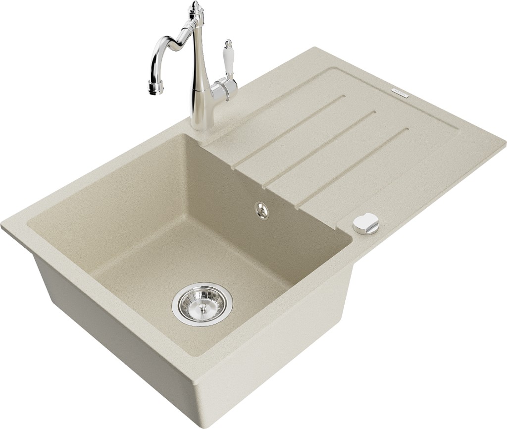 Technická data: dřez: Rozměr: 795 x 495 x 200 mm Hloubka komory: 200 mm Rozměry komory: 440x360 mm Průměr odtoku: ø90 mm Typ: 1-miska s odkapávačem Typ: Zapuštěné do pracovní desky Barva béžová Povrchová úprava sifonu: Chrome Materiál: žula (80 % žulové kamenivo, 20 % pryskyřice) Přepadový otvor: Ano Otvory: (baterie, automatické) 2 Instalace: Univerzální, lze instalovat s odkapávačem na levou nebo pravou stranu Vysoká odolnost proti poškrábání a změně barvy Odolnost proti tepelným šokům Snadno čistitelný povrch Dva dodatečné vyfrézované otvory pro samoděrování ø35 kuchyňská baterie: Materiál: mosaz Barva: Chrome Hlava: Keramická Provzdušňovač: Ano Typ: Jedna páka Výška baterie: 290 mm Rozsah výtoku: 260 mm