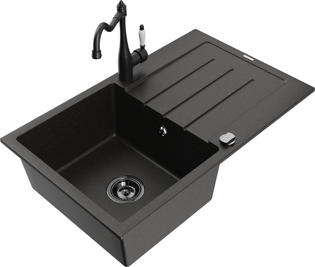 Technická data: dřez: Rozměr: 795 x 495 x 200 mm Hloubka komory: 200 mm Rozměry komory: 440x360 mm Průměr odtoku: ø90 mm Typ: 1-miska s odkapávačem Typ: Zapuštěné do pracovní desky Barva: černá/zlatá metalíza Povrchová úprava sifonu: černá Materiál: žula (80 % žulové kamenivo, 20 % pryskyřice) Přepadový otvor: Ano Otvory: (baterie, automatické) 2 Instalace: Univerzální, lze instalovat s odkapávačem na levou nebo pravou stranu Vysoká odolnost proti poškrábání a změně barvy Odolnost proti tepelným šokům Snadno čistitelný povrch Dva dodatečné vyfrézované otvory pro samoděrování ø35 kuchyňská baterie: Materiál: mosaz Černá barva Hlava: Keramická Provzdušňovač: Ano Typ: Jedna páka Výška baterie: 290 mm Rozsah výtoku: 260 mm