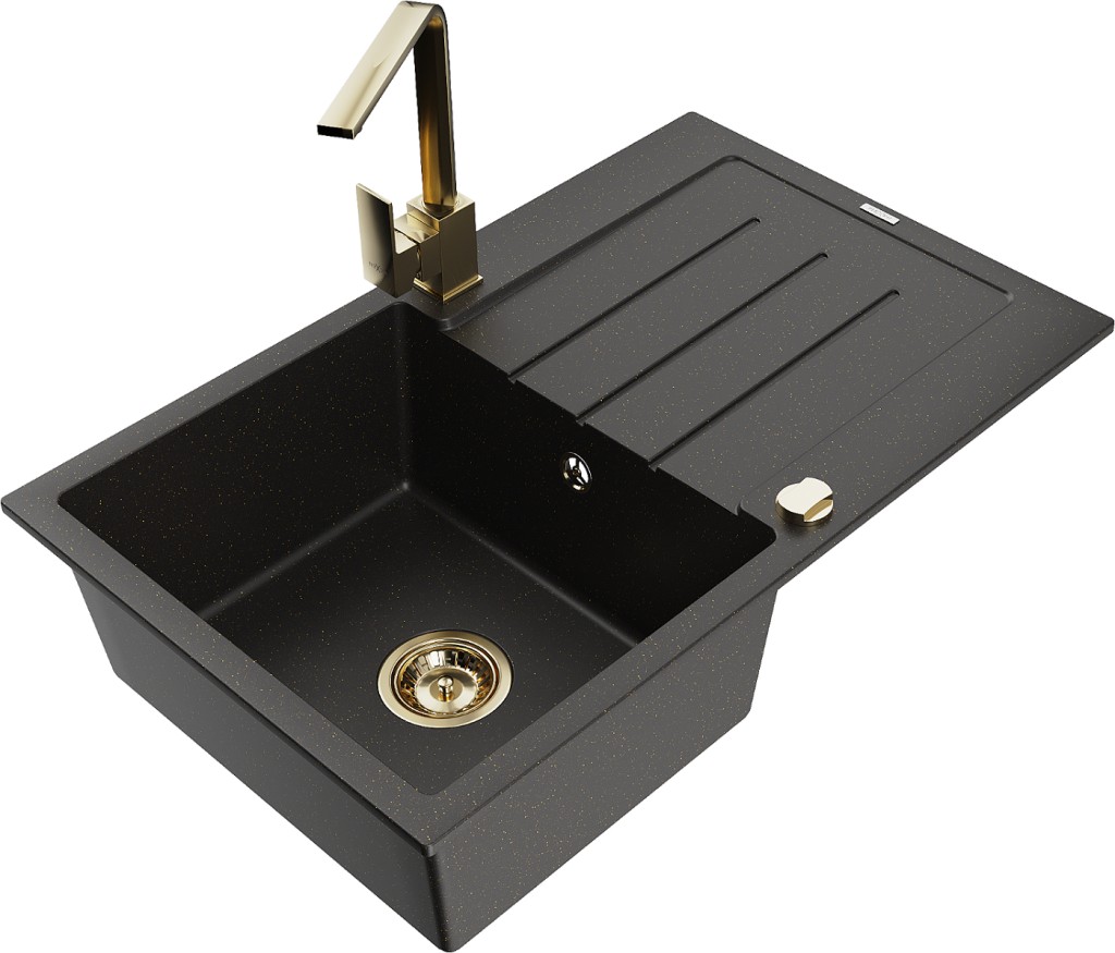 Technická data: dřez: Rozměr: 795 x 495 x 200 mm Hloubka komory: 200 mm Rozměry komory: 440x360 mm Průměr odtoku: ø90 mm Typ: 1-miska s odkapávačem Typ: Zapuštěné do pracovní desky Barva: černá/zlatá metalíza Povrchová úprava sifonu: zlatá Materiál: žula (80 % žulové kamenivo, 20 % pryskyřice) Přepadový otvor: Ano Otvory: (baterie, automatické) 2 Instalace: Univerzální, lze instalovat s odkapávačem na levou nebo pravou stranu Vysoká odolnost proti poškrábání a změně barvy Odolnost proti tepelným šokům Snadno čistitelný povrch Dva dodatečné vyfrézované otvory pro samoděrování ø35 kuchyňská baterie: Materiál: mosaz Barva: Zlatá Hlava: Keramická Provzdušňovač: Ano Typ: Jedna páka Výška baterie: 290 mm Rozsah výtoku: 220 mm