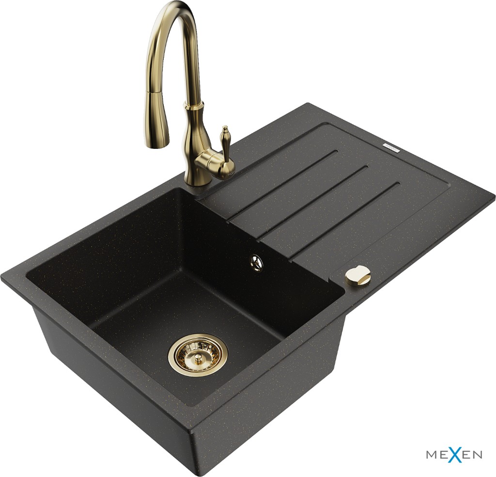Technická data: dřez: Rozměr: 795 x 495 x 200 mm Hloubka komory: 200 mm Rozměry komory: 440x360 mm Průměr odtoku: ø90 mm Typ: 1-miska s odkapávačem Typ: Zapuštěné do pracovní desky Barva: černá/zlatá metalíza Povrchová úprava sifonu: zlatá Materiál: žula (80 % žulové kamenivo, 20 % pryskyřice) Přepadový otvor: Ano Otvory: (baterie, automatické) 2 Instalace: Univerzální, lze instalovat s odkapávačem na levou nebo pravou stranu Vysoká odolnost proti poškrábání a změně barvy Odolnost proti tepelným šokům Snadno čistitelný povrch Dva dodatečné vyfrézované otvory pro samoděrování ø35 kuchyňská baterie: Materiál: mosaz Barva: Zlatá Hlava: Keramická Provzdušňovač: Ano Typ: Jedna páka Výška baterie: 410 mm Rozsah výtoku: 231 mm