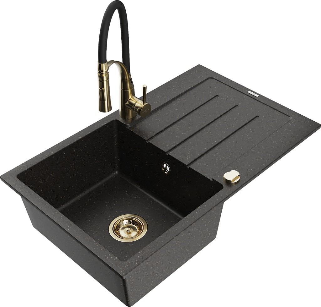 Technická data: dřez: Rozměr: 795 x 495 x 200 mm Hloubka komory: 200 mm Rozměry komory: 440x360 mm Průměr odtoku: ø90 mm Typ: 1-miska s odkapávačem Typ: Zapuštěné do pracovní desky Barva: černá/zlatá metalíza Povrchová úprava sifonu: zlatá Materiál: žula (80 % žulové kamenivo, 20 % pryskyřice) Přepadový otvor: Ano Otvory: (baterie, automatické) 2 Instalace: Univerzální, lze instalovat s odkapávačem na levou nebo pravou stranu Vysoká odolnost proti poškrábání a změně barvy Odolnost proti tepelným šokům Snadno čistitelný povrch Dva dodatečné vyfrézované otvory pro samoděrování ø35 kuchyňská baterie: Materiál: mosaz Barva: Zlatá/Černá Hlava: Keramická Provzdušňovač: Ano Typ: Jedna páka Výška baterie: 430 mm Rozsah výtoku: 185 mm Baterie má výsuvný výtok
