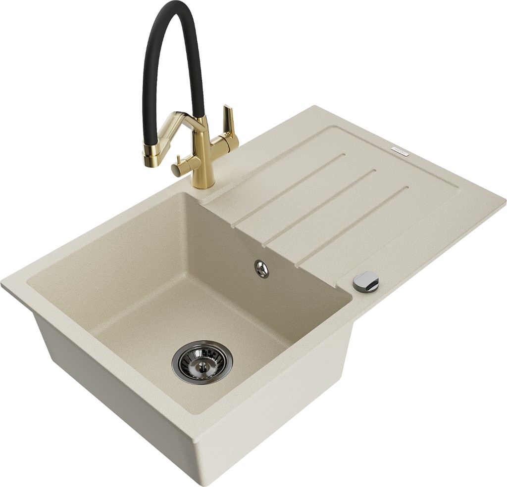 Technická data: dřez: Rozměr: 795 x 495 x 200 mm Hloubka komory: 200 mm Rozměry komory: 440x360 mm Průměr odtoku: ø90 mm Typ: 1-miska s odkapávačem Typ: Zapuštěné do pracovní desky Barva béžová Povrchová úprava sifonu: černá Materiál: žula (80 % žulové kamenivo, 20 % pryskyřice) Přepadový otvor: Ano Otvory: (baterie, automatické) 2 Instalace: Univerzální, lze instalovat s odkapávačem na levou nebo pravou stranu Vysoká odolnost proti poškrábání a změně barvy Odolnost proti tepelným šokům Snadno čistitelný povrch Dva dodatečné vyfrézované otvory pro samoděrování ø35 kuchyňská baterie: Materiál: mosaz Barva: Zlatá/Černá Hlavy: Keramické Provzdušňovač: Ano Typ hubice: Flexibilní s mosazným držákem Rozsah výtoku: 260 mm Výška: 405 mm Typ: Dvě rukojeti Dvouhlavá baterie s přídavným filtrem na pitnou vodu