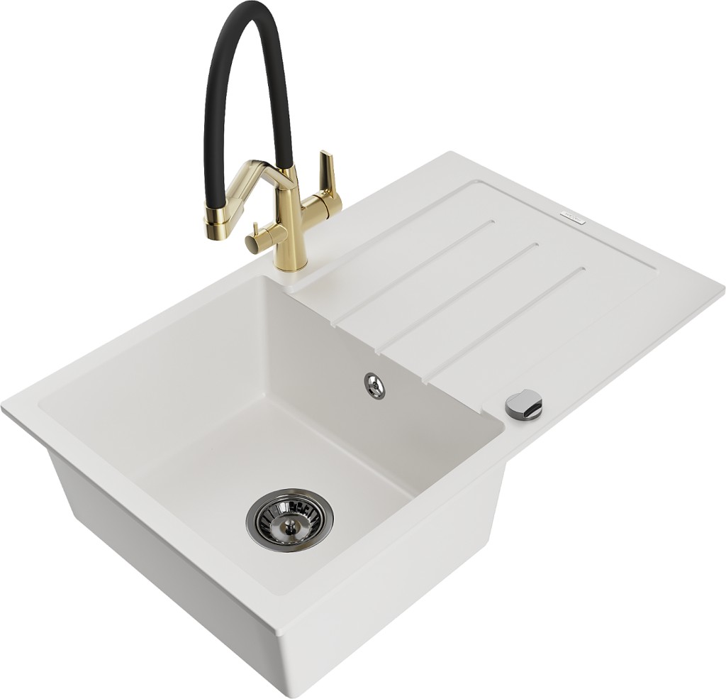 Technická data: dřez: Rozměr: 795 x 495 x 200 mm Hloubka komory: 200 mm Rozměry komory: 440x360 mm Průměr odtoku: ø90 mm Typ: 1-miska s odkapávačem Typ: Zapuštěné do pracovní desky bílá barva Povrchová úprava sifonu: černá Materiál: žula (80 % žulové kamenivo, 20 % pryskyřice) Přepadový otvor: Ano Otvory: (baterie, automatické) 2 Instalace: Univerzální, lze instalovat s odkapávačem na levou nebo pravou stranu Vysoká odolnost proti poškrábání a změně barvy Odolnost proti tepelným šokům Snadno čistitelný povrch Dva dodatečné vyfrézované otvory pro samoděrování ø35 kuchyňská baterie: Materiál: mosaz Barva: Zlatá/Černá Hlavy: Keramické Provzdušňovač: Ano Typ hubice: Flexibilní s mosazným držákem Rozsah výtoku: 260 mm Výška: 405 mm Typ: Dvě rukojeti Dvouhlavá baterie s přídavným filtrem na pitnou vodu
