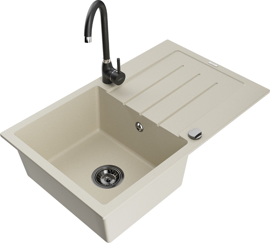 Technická data: dřez: Rozměr: 795 x 495 x 200 mm Hloubka komory: 200 mm Rozměry komory: 440x360 mm Průměr odtoku: ø90 mm Typ: 1-miska s odkapávačem Typ: Zapuštěné do pracovní desky Barva béžová Povrchová úprava sifonu: černá Materiál: žula (80 % žulové kamenivo, 20 % pryskyřice) Přepadový otvor: Ano Otvory: (baterie, automatické) 2 Instalace: Univerzální, lze instalovat s odkapávačem na levou nebo pravou stranu Vysoká odolnost proti poškrábání a změně barvy Odolnost proti tepelným šokům Snadno čistitelný povrch Dva dodatečné vyfrézované otvory pro samoděrování ø35 kuchyňská baterie: Materiál: mosaz Černá barva Hlava: Keramická Provzdušňovač: Ano Typ: Jedna páka Výška baterie: 335 mm Rozsah výtoku: 180 mm