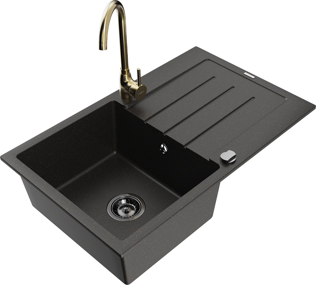 Technická data: dřez: Rozměr: 795 x 495 x 200 mm Hloubka komory: 200 mm Rozměry komory: 440x360 mm Průměr odtoku: ø90 mm Typ: 1-miska s odkapávačem Typ: Zapuštěné do pracovní desky Barva: černá/zlatá metalíza Povrchová úprava sifonu: černá Materiál: žula (80 % žulové kamenivo, 20 % pryskyřice) Přepadový otvor: Ano Otvory: (baterie, automatické) 2 Instalace: Univerzální, lze instalovat s odkapávačem na levou nebo pravou stranu Vysoká odolnost proti poškrábání a změně barvy Odolnost proti tepelným šokům Snadno čistitelný povrch Dva dodatečné vyfrézované otvory pro samoděrování ø35 kuchyňská baterie: Materiál: mosaz Barva: Zlatá Hlava: Keramická Provzdušňovač: Ano Typ: Jedna páka Výška baterie: 335 mm Rozsah výtoku: 180 mm