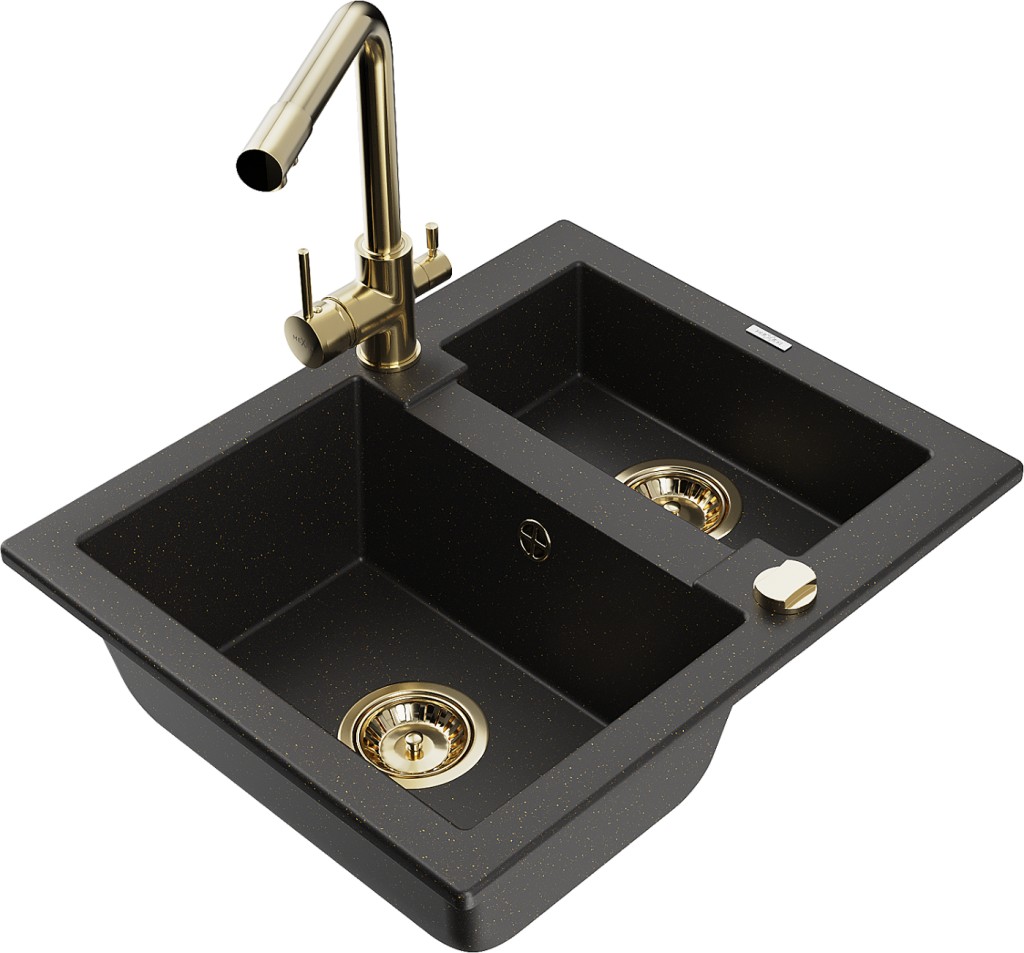 Technická data: Dřez: Rozměr: 582x475x177 mm Hloubka komory: 162 mm (větší), 102 mm (menší) Rozměry komory: 395x272 mm (větší), 375x182 mm (menší) Průměr odtoku: ø90 mm Typ: 1,5-komorový Typ: Zapuštěné do pracovní desky Barva: černá/zlatá metalíza Povrchová úprava sifonu: zlatá Materiál: žula (80% žulové kamenivo 20% pryskyřice) Přepadový otvor: Ano Otvory: (baterie, automat) 2 Vysoká odolnost proti poškrábání a změně barvy Odolnost proti tepelným šokům Povrch pro snadné čištění Jeden dodatečný vyfrézovaný otvor pro samoděrování ø35 Kuchyňská baterie: Materiál: mosaz Barva: Zlatá Hlava: Keramická Perlátor: Ano Typ: Dvě rukojeti Rozsah výtoku: 235 mm Výška baterie: 315 mm Dvouhlavá baterie s přídavným filtrem na pitnou vodu