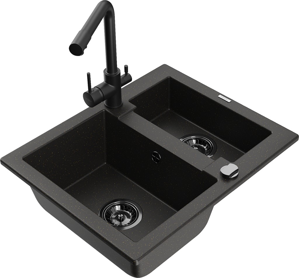 Technická data: Dřez: Rozměr: 582x475x177 mm Hloubka komory: 162 mm (větší), 102 mm (menší) Rozměry komory: 395x272 mm (větší), 375x182 mm (menší) Průměr odtoku: ø90 mm Typ: 1,5-komorový Typ: Zapuštěné do pracovní desky Barva: černá/zlatá metalíza Povrchová úprava sifonu: černá Materiál: žula (80% žulové kamenivo 20% pryskyřice) Přepadový otvor: Ano Otvory: (baterie, automat) 2 Vysoká odolnost proti poškrábání a změně barvy Odolnost proti tepelným šokům Povrch pro snadné čištění Jeden dodatečný vyfrézovaný otvor pro samoděrování ø35 Kuchyňská baterie: Materiál: mosaz Černá barva Hlava: Keramická Perlátor: Ano Typ: Dvě rukojeti Rozsah výtoku: 235 mm Výška baterie: 315 mm Dvouhlavá baterie s přídavným filtrem na pitnou vodu