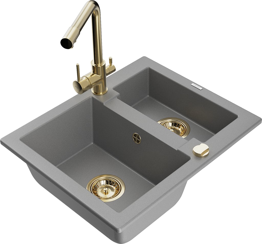 Technická data: dřez: Rozměr: 582 x 475 x 177 mm Hloubka komory: 162 mm (větší), 102 mm (menší) Rozměry komory: 395x272 mm (větší), 375x182 mm (menší) Průměr odtoku: ø90 mm Typ: 1,5 komory Typ: Zapuštěné do pracovní desky Šedá barva Povrchová úprava sifonu: zlatá Materiál: žula (80 % žulové kamenivo, 20 % pryskyřice) Přepadový otvor: Ano Otvory: (baterie, automatické) 2 Vysoká odolnost proti poškrábání a změně barvy Odolnost proti tepelným šokům Snadno čistitelný povrch Jeden dodatečný vyfrézovaný otvor pro samoděrování ø35 kuchyňská baterie: Materiál: mosaz Barva: Zlatá Hlava: Keramická Provzdušňovač: Ano Typ: Dvě rukojeti Rozsah výtoku: 235 mm Výška baterie: 315 mm Dvouhlavá baterie s přídavným filtrem na pitnou vodu