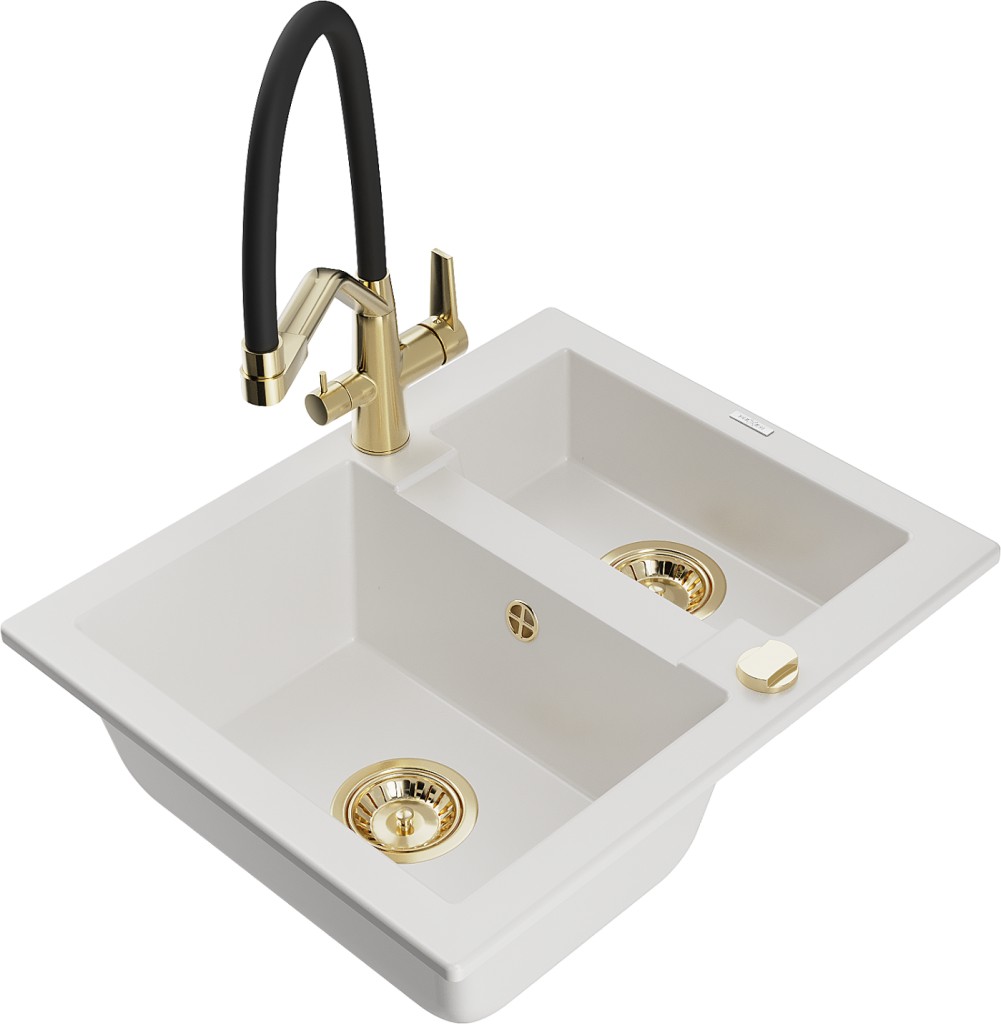 Technická data: dřez: Rozměr: 582 x 475 x 177 mm Hloubka komory: 162 mm (větší), 102 mm (menší) Rozměry komory: 395x272 mm (větší), 375x182 mm (menší) Průměr odtoku: ø90 mm Typ: 1,5 komory Typ: Zapuštěné do pracovní desky bílá barva Povrchová úprava sifonu: zlatá Materiál: žula (80 % žulové kamenivo, 20 % pryskyřice) Přepadový otvor: Ano Otvory: (baterie, automatické) 2 Vysoká odolnost proti poškrábání a změně barvy Odolnost proti tepelným šokům Snadno čistitelný povrch kuchyňská baterie: Materiál: mosaz Barva: Zlatá/Černá Hlavy: Keramické Provzdušňovač: Ano Typ hubice: Flexibilní s mosazným držákem Rozsah výtoku: 260 mm Výška: 405 mm Typ: Dvě rukojeti Dvouhlavá baterie s přídavným filtrem na pitnou vodu