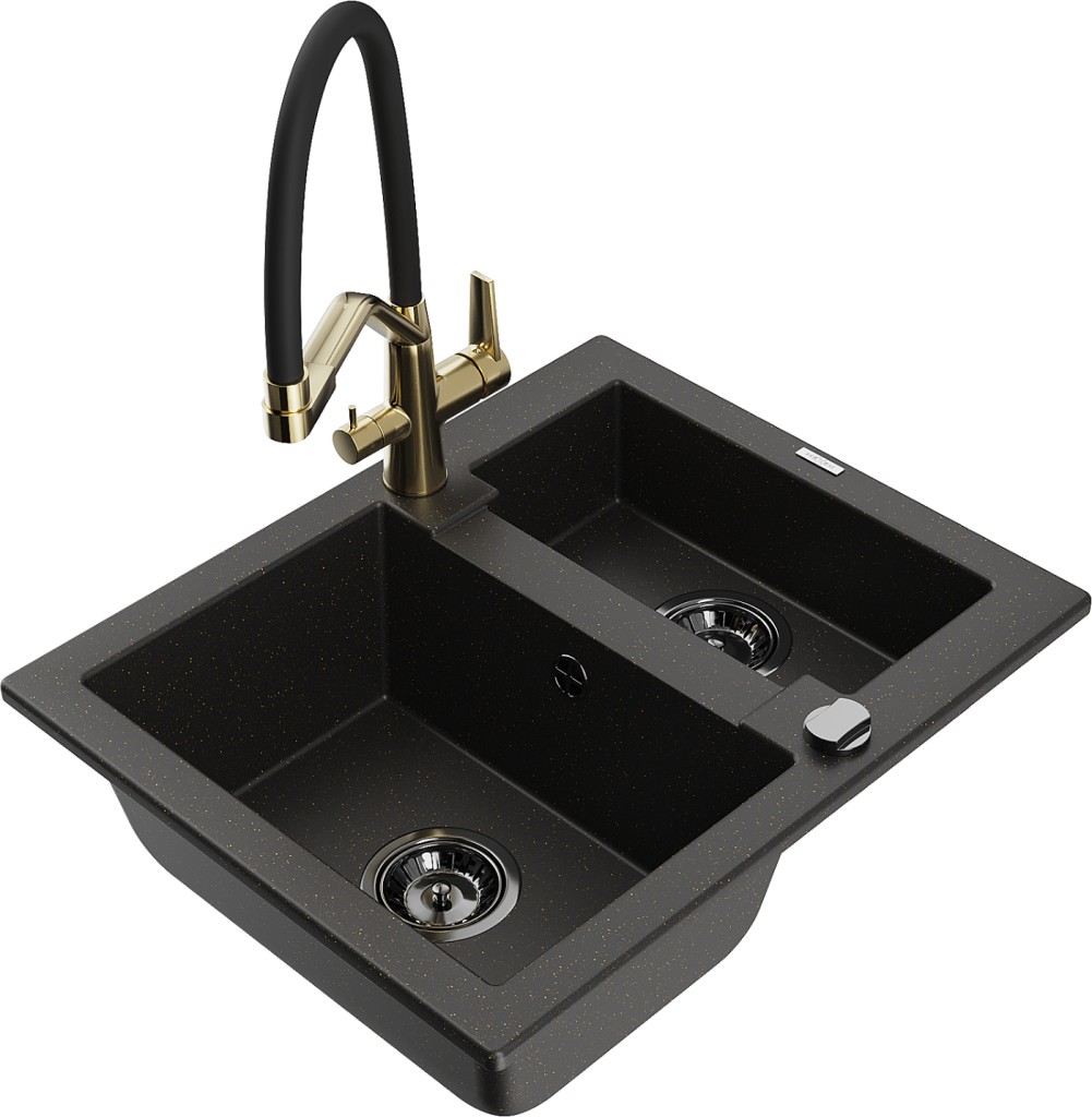Technická data: Dřez: Rozměr: 582x475x177 mm Hloubka komory: 162 mm (větší), 102 mm (menší) Rozměry komory: 395x272 mm (větší), 375x182 mm (menší) Průměr odtoku: ø90 mm Typ: 1,5-komorový Typ: Zapuštěné do pracovní desky Barva: černá/zlatá metalíza Povrchová úprava sifonu: černá Materiál: žula (80% žulové kamenivo 20% pryskyřice) Přepadový otvor: Ano Otvory: (baterie, automat) 2 Vysoká odolnost proti poškrábání a změně barvy Odolnost proti tepelným šokům Povrch pro snadné čištění Kuchyňská baterie: Materiál: mosaz Barva: Zlatá/Černá Hlavy: Keramické Perlátor: Ano Typ výtoku: Flexibilní s mosazným držákem Rozsah výtoku: 260 mm Výška: 405 mm Typ: Dvě rukojeti Dvouhlavá baterie s přídavným filtrem na pitnou vodu