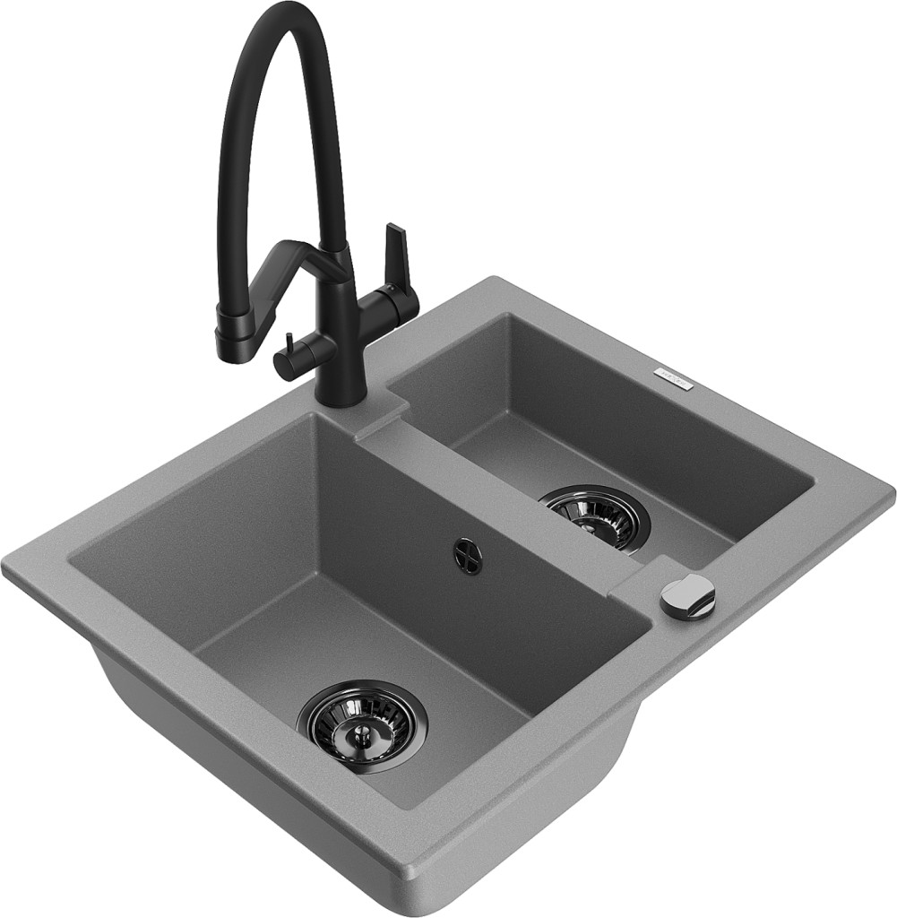 Technická data: dřez: Rozměr: 582 x 475 x 177 mm Hloubka komory: 162 mm (větší), 102 mm (menší) Rozměry komory: 395x272 mm (větší), 375x182 mm (menší) Průměr odtoku: ø90 mm Typ: 1,5 komory Typ: Zapuštěné do pracovní desky Šedá barva Povrchová úprava sifonu: černá Materiál: žula (80 % žulové kamenivo, 20 % pryskyřice) Přepadový otvor: Ano Otvory: (baterie, automatické) 2 Vysoká odolnost proti poškrábání a změně barvy Odolnost proti tepelným šokům Snadno čistitelný povrch kuchyňská baterie: Materiál: mosaz Černá barva Hlavy: Keramické Provzdušňovač: Ano Typ hubice: Flexibilní s mosazným držákem Rozsah výtoku: 260 mm Výška: 405 mm Typ: Dvě rukojeti Dvouhlavá baterie s přídavným filtrem na pitnou vodu