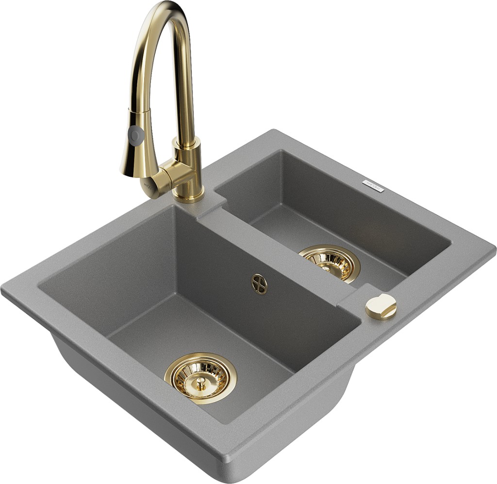Technická data: dřez: Rozměr: 582 x 475 x 177 mm Hloubka komory: 162 mm (větší), 102 mm (menší) Rozměry komory: 395x272 mm (větší), 375x182 mm (menší) Průměr odtoku: ø90 mm Typ: 1,5 komory Typ: Zapuštěné do pracovní desky Šedá barva Povrchová úprava sifonu: zlatá Materiál: žula (80 % žulové kamenivo, 20 % pryskyřice) Přepadový otvor: Ano Otvory: (baterie, automatické) 2 Vysoká odolnost proti poškrábání a změně barvy Odolnost proti tepelným šokům Snadno čistitelný povrch Jeden dodatečný vyfrézovaný otvor pro samoděrování ø35 kuchyňská baterie: Materiál: mosaz Barva: Zlatá Hlava: Keramická Provzdušňovač: Ano Typ: Jedna páka Výška baterie: 380 mm Rozsah výtoku: 252 mm Typ výtoku: Výsuvný