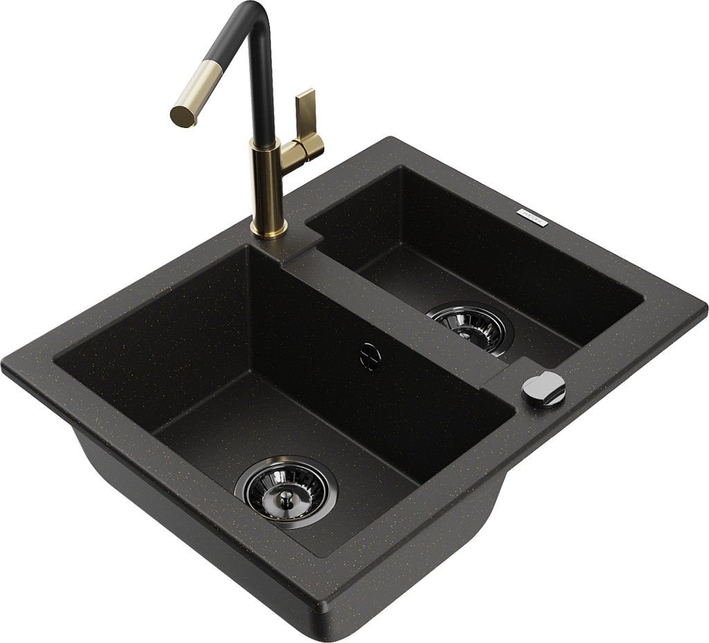 Technická data: dřez: Rozměr: 582 x 475 x 177 mm Hloubka komory: 162 mm (větší), 102 mm (menší) Rozměry komory: 395x272 mm (větší), 375x182 mm (menší) Průměr odtoku: ø90 mm Typ: 1,5 komory Typ: Zapuštěné do pracovní desky Barva: černá/zlatá metalíza Povrchová úprava sifonu: černá Materiál: žula (80 % žulové kamenivo, 20 % pryskyřice) Přepadový otvor: Ano Otvory: (baterie, automatické) 2 Vysoká odolnost proti poškrábání a změně barvy Odolnost proti tepelným šokům Snadno čistitelný povrch Jeden dodatečný vyfrézovaný otvor pro samoděrování ø35 kuchyňská baterie: Materiál: mosaz Barva: Zlatá/Černá Hlava: Keramická Provzdušňovač: Ano Typ: Jedna páka Rozsah výtoku: 245 mm Výška baterie: 307 mm