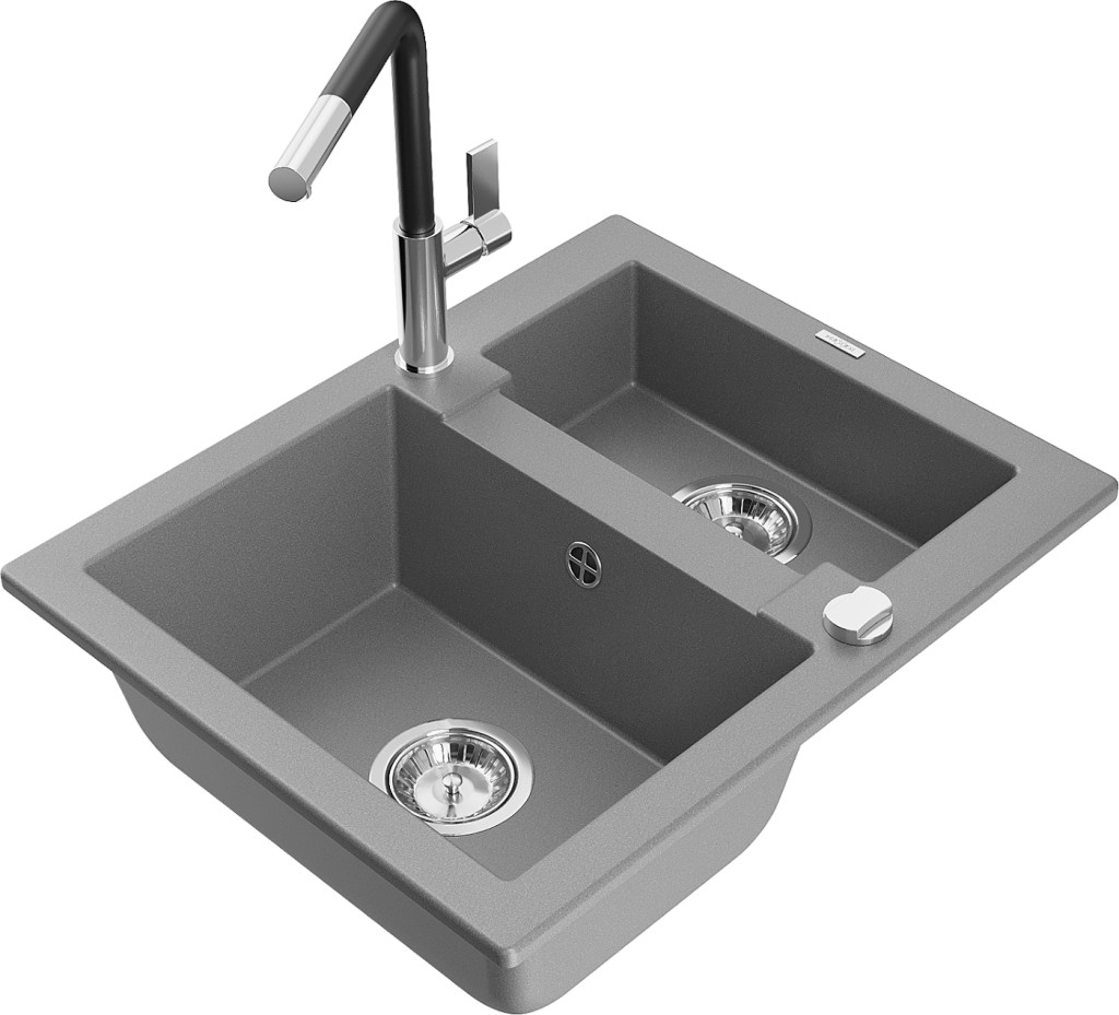 Technická data: dřez: Rozměr: 582 x 475 x 177 mm Hloubka komory: 162 mm (větší), 102 mm (menší) Rozměry komory: 395x272 mm (větší), 375x182 mm (menší) Průměr odtoku: ø90 mm Typ: 1,5 komory Typ: Zapuštěné do pracovní desky Šedá barva Povrchová úprava sifonu: Chrome Materiál: žula (80 % žulové kamenivo, 20 % pryskyřice) Přepadový otvor: Ano Otvory: (baterie, automatické) 2 Vysoká odolnost proti poškrábání a změně barvy Odolnost proti tepelným šokům Snadno čistitelný povrch Jeden dodatečný vyfrézovaný otvor pro samoděrování ø35 kuchyňská baterie: Materiál: mosaz Barva: chrom/černá Hlava: Keramická Provzdušňovač: Ano Typ: Jedna páka Rozsah výtoku: 245 mm Výška baterie: 307 mm