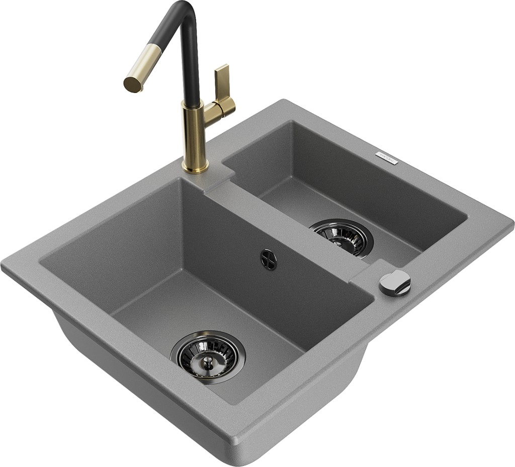 Technická data: dřez: Rozměr: 582 x 475 x 177 mm Hloubka komory: 162 mm (větší), 102 mm (menší) Rozměry komory: 395x272 mm (větší), 375x182 mm (menší) Průměr odtoku: ø90 mm Typ: 1,5 komory Typ: Zapuštěné do pracovní desky Šedá barva Povrchová úprava sifonu: černá Materiál: žula (80 % žulové kamenivo, 20 % pryskyřice) Přepadový otvor: Ano Otvory: (baterie, automatické) 2 Vysoká odolnost proti poškrábání a změně barvy Odolnost proti tepelným šokům Snadno čistitelný povrch Jeden dodatečný vyfrézovaný otvor pro samoděrování ø35 kuchyňská baterie: Materiál: mosaz Barva: Zlatá/Černá Hlava: Keramická Provzdušňovač: Ano Typ: Jedna páka Rozsah výtoku: 245 mm Výška baterie: 307 mm