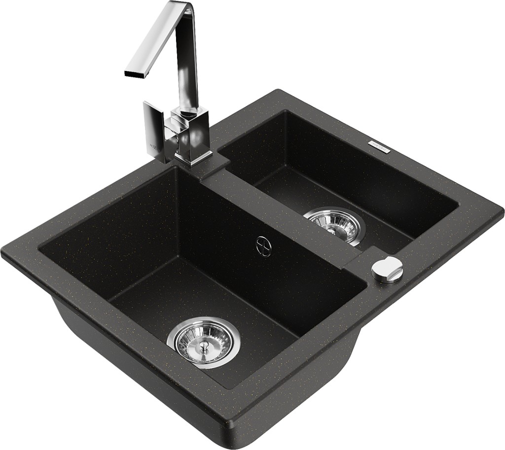 Technická data: dřez: Rozměr: 582 x 475 x 177 mm Hloubka komory: 162 mm (větší), 102 mm (menší) Rozměry komory: 395x272 mm (větší), 375x182 mm (menší) Průměr odtoku: ø90 mm Typ: 1,5 komory Typ: Zapuštěné do pracovní desky Barva: černá/zlatá metalíza Povrchová úprava sifonu: Chrome Materiál: žula (80 % žulové kamenivo, 20 % pryskyřice) Přepadový otvor: Ano Otvory: (baterie, automatické) 2 Vysoká odolnost proti poškrábání a změně barvy Odolnost proti tepelným šokům Snadno čistitelný povrch Jeden dodatečný vyfrézovaný otvor pro samoděrování ø35 kuchyňská baterie: Materiál: mosaz Barva: Chrome Hlava: Keramická Provzdušňovač: Ano Typ: Jedna páka Výška baterie: 290 mm Rozsah výtoku: 220 mm