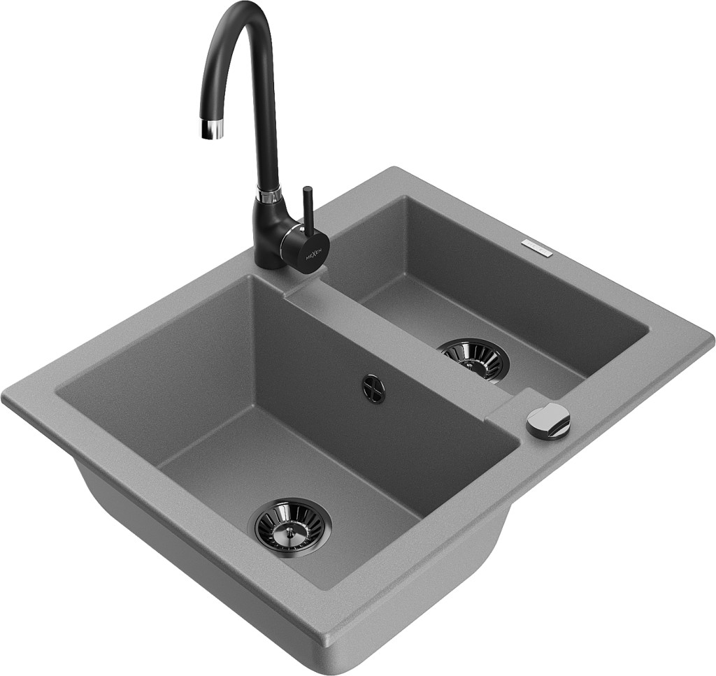 Technická data: dřez: Rozměr: 582 x 475 x 177 mm Hloubka komory: 162 mm (větší), 102 mm (menší) Rozměry komory: 395x272 mm (větší), 375x182 mm (menší) Průměr odtoku: ø90 mm Typ: 1,5 komory Typ: Zapuštěné do pracovní desky Šedá barva Povrchová úprava sifonu: černá Materiál: žula (80 % žulové kamenivo, 20 % pryskyřice) Přepadový otvor: Ano Otvory: (baterie, automatické) 2 Vysoká odolnost proti poškrábání a změně barvy Odolnost proti tepelným šokům Snadno čistitelný povrch Jeden dodatečný vyfrézovaný otvor pro samoděrování ø35 kuchyňská baterie: Materiál: mosaz Černá barva Hlava: Keramická Provzdušňovač: Ano Typ: Jedna páka Výška baterie: 335 mm Rozsah výtoku: 180 mm