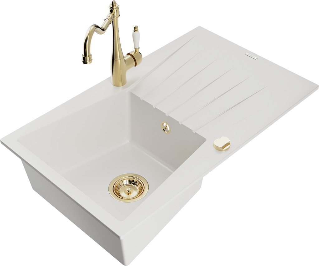 Technická data: dřez: Rozměr: 775x470x200mm Hloubka komory: 180 mm Rozměry komory: 410x355 mm Průměr odtoku: ø90 mm Typ: 1-miska s odkapávačem Typ: Zapuštěné do pracovní desky bílá barva Povrchová úprava sifonu: zlatá Materiál: žula (80 % žulové kamenivo, 20 % pryskyřice) Přepadový otvor: Ano Otvory: (baterie, automatické) 2 Instalace: Univerzální, lze instalovat s odkapávačem na levou nebo pravou stranu Vysoká odolnost proti poškrábání a změně barvy Odolnost proti tepelným šokům Snadno čistitelný povrch kuchyňská baterie: Materiál: mosaz Barva: Zlatá Hlava: Keramická Provzdušňovač: Ano Typ: Jedna páka Výška baterie: 290 mm Rozsah výtoku: 260 mm