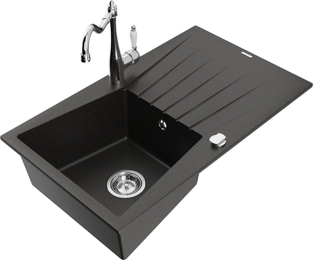Technická data: dřez: Rozměr: 775x470x200mm Hloubka komory: 180 mm Rozměry komory: 410x355 mm Průměr odtoku: ø90 mm Typ: 1-miska s odkapávačem Typ: Zapuštěné do pracovní desky Barva: černá/zlatá metalíza Povrchová úprava sifonu: Chrome Materiál: žula (80 % žulové kamenivo, 20 % pryskyřice) Přepadový otvor: Ano Otvory: (baterie, automatické) 2 Instalace: Univerzální, lze instalovat s odkapávačem na levou nebo pravou stranu Vysoká odolnost proti poškrábání a změně barvy Odolnost proti tepelným šokům Snadno čistitelný povrch kuchyňská baterie: Materiál: mosaz Barva: Chrome Hlava: Keramická Provzdušňovač: Ano Typ: Jedna páka Výška baterie: 290 mm Rozsah výtoku: 260 mm