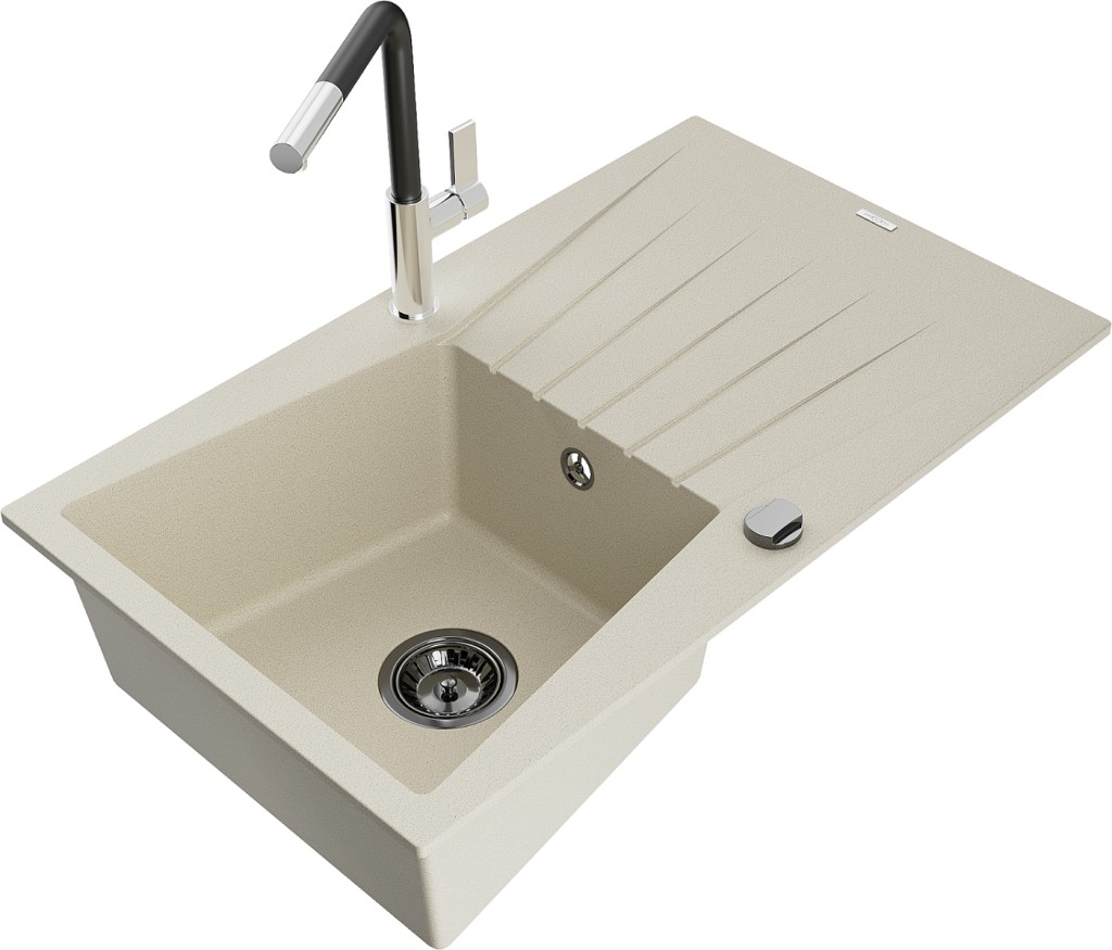 Technická data: dřez: Rozměr: 775x470x200mm Hloubka komory: 180 mm Rozměry komory: 410x355 mm Průměr odtoku: ø90 mm Typ: 1-miska s odkapávačem Typ: Zapuštěné do pracovní desky Barva béžová Povrchová úprava sifonu: černá Materiál: žula (80 % žulové kamenivo, 20 % pryskyřice) Přepadový otvor: Ano Otvory: (baterie, automatické) 2 Instalace: Univerzální, lze instalovat s odkapávačem na levou nebo pravou stranu Vysoká odolnost proti poškrábání a změně barvy Odolnost proti tepelným šokům Snadno čistitelný povrch kuchyňská baterie: Materiál: mosaz Barva: chrom/černá Hlava: Keramická Provzdušňovač: Ano Typ: Jedna páka Rozsah výtoku: 245 mm Výška baterie: 307 mm