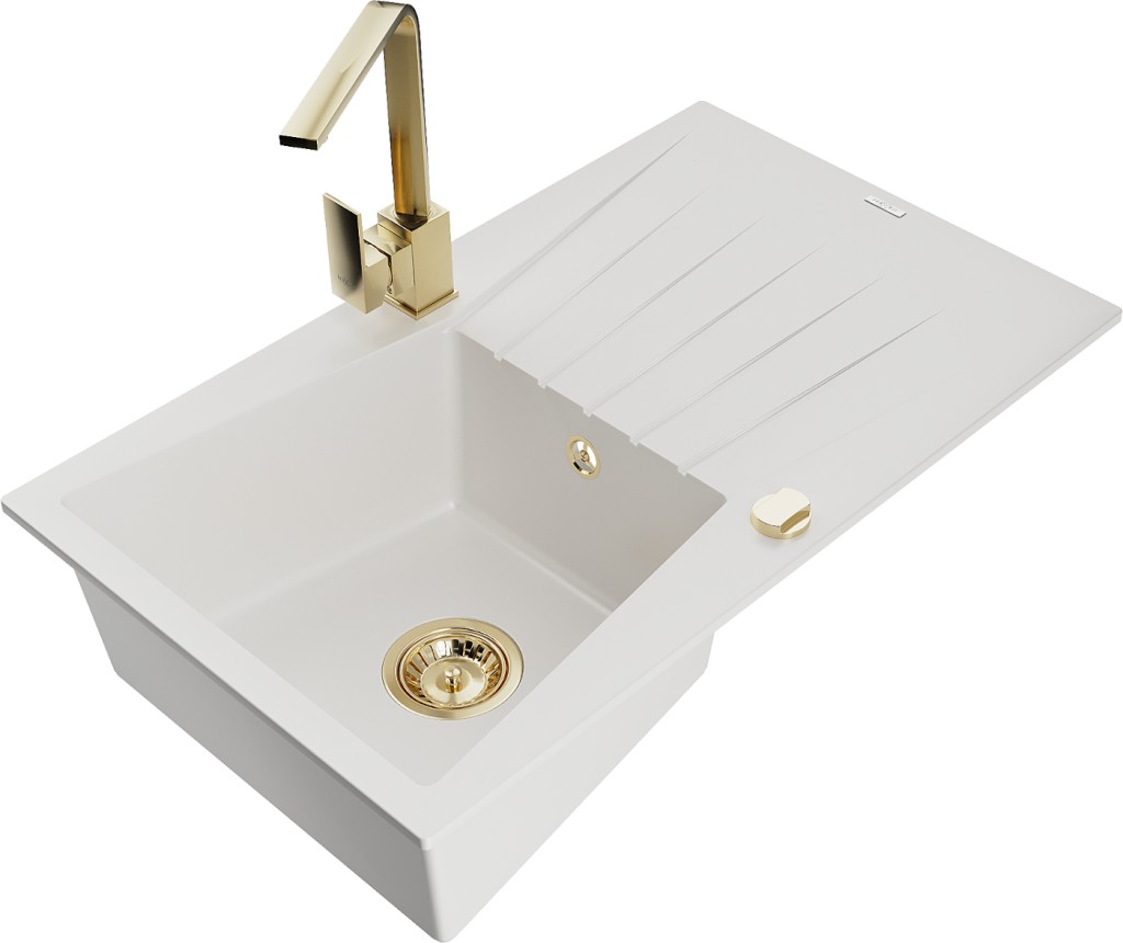 Technická data: dřez: Rozměr: 775x470x200mm Hloubka komory: 180 mm Rozměry komory: 410x355 mm Průměr odtoku: ø90 mm Typ: 1-miska s odkapávačem Typ: Zapuštěné do pracovní desky bílá barva Povrchová úprava sifonu: zlatá Materiál: žula (80 % žulové kamenivo, 20 % pryskyřice) Přepadový otvor: Ano Otvory: (baterie, automatické) 2 Instalace: Univerzální, lze instalovat s odkapávačem na levou nebo pravou stranu Vysoká odolnost proti poškrábání a změně barvy Odolnost proti tepelným šokům Snadno čistitelný povrch kuchyňská baterie: Materiál: mosaz Barva: Zlatá Hlava: Keramická Provzdušňovač: Ano Typ: Jedna páka Výška baterie: 290 mm Rozsah výtoku: 220 mm