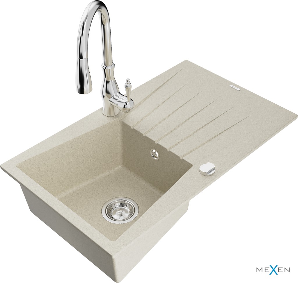 Technická data: dřez: Rozměr: 775x470x200mm Hloubka komory: 180 mm Rozměry komory: 410x355 mm Průměr odtoku: ø90 mm Typ: 1-miska s odkapávačem Typ: Zapuštěné do pracovní desky Barva béžová Povrchová úprava sifonu: Chrome Materiál: žula (80 % žulové kamenivo, 20 % pryskyřice) Přepadový otvor: Ano Otvory: (baterie, automatické) 2 Instalace: Univerzální, lze instalovat s odkapávačem na levou nebo pravou stranu Vysoká odolnost proti poškrábání a změně barvy Odolnost proti tepelným šokům Snadno čistitelný povrch kuchyňská baterie: Materiál: mosaz Barva: Chrome Hlava: Keramická Provzdušňovač: Ano Typ: Jedna páka Výška baterie: 410 mm Rozsah výtoku: 231 mm