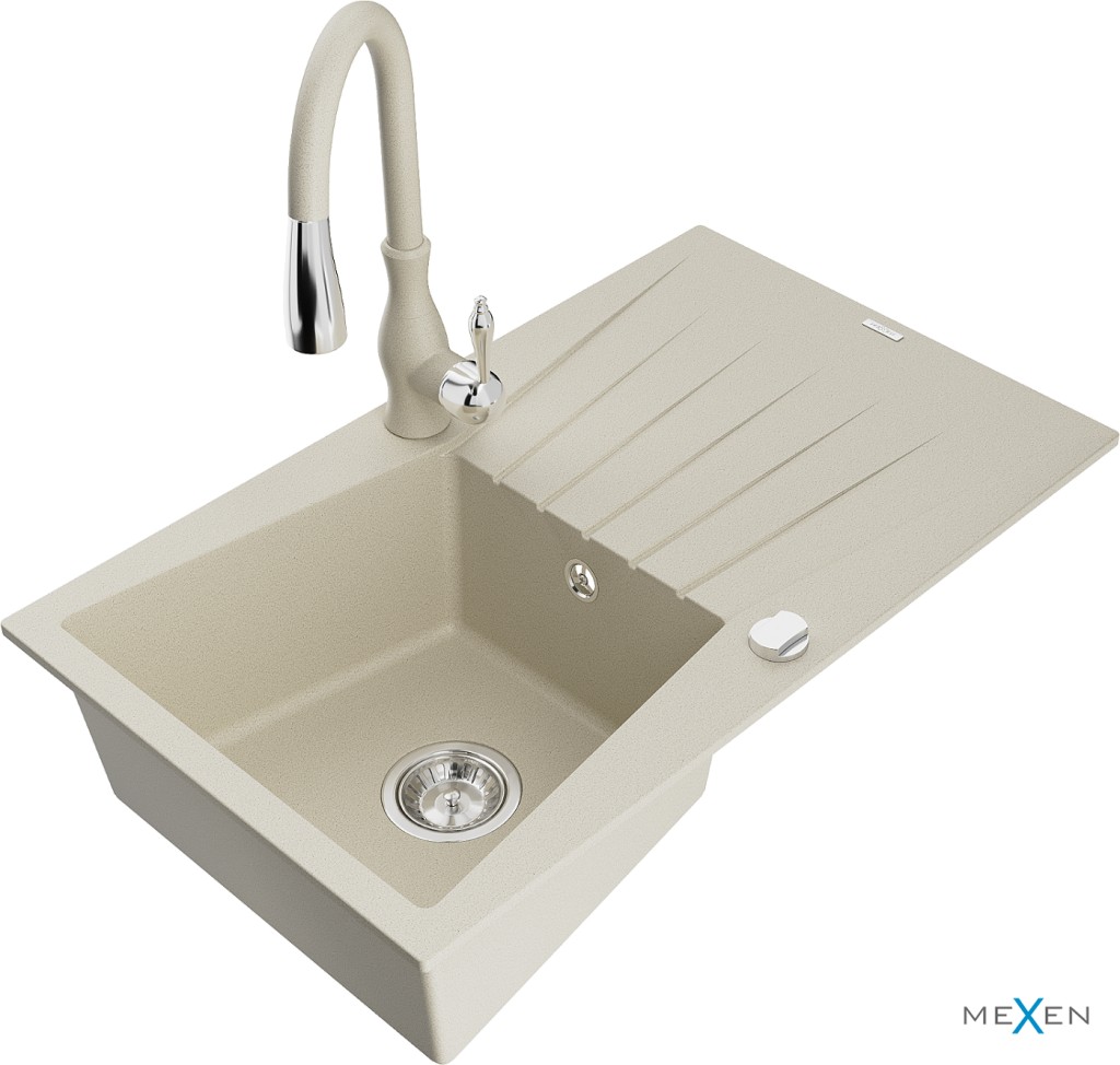 Technická data: dřez: Rozměr: 775x470x200mm Hloubka komory: 180 mm Rozměry komory: 410x355 mm Průměr odtoku: ø90 mm Typ: 1-miska s odkapávačem Typ: Zapuštěné do pracovní desky Barva béžová Povrchová úprava sifonu: Chrome Materiál: žula (80 % žulové kamenivo, 20 % pryskyřice) Přepadový otvor: Ano Otvory: (baterie, automatické) 2 Instalace: Univerzální, lze instalovat s odkapávačem na levou nebo pravou stranu Vysoká odolnost proti poškrábání a změně barvy Odolnost proti tepelným šokům Snadno čistitelný povrch kuchyňská baterie: Materiál: mosaz Barva béžová Hlava: Keramická Provzdušňovač: Ano Typ: Jedna páka Výška baterie: 410 mm Rozsah výtoku: 231 mm