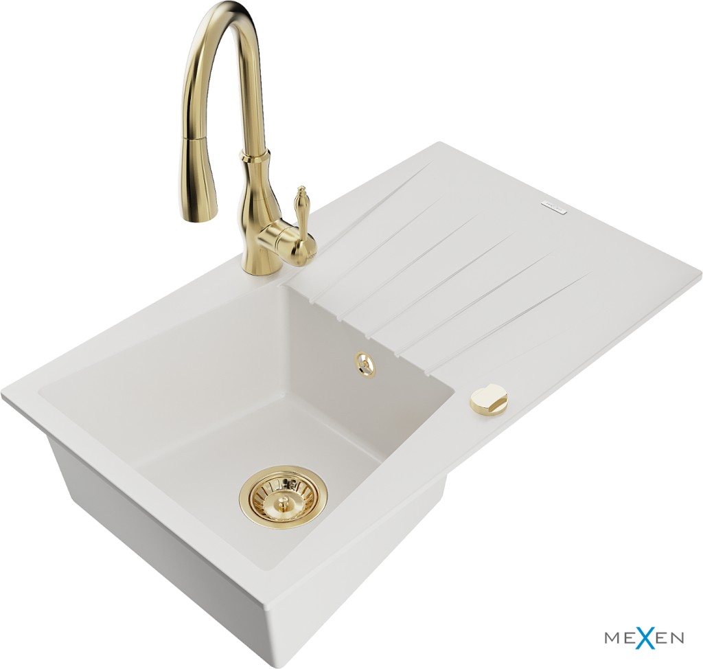 Technická data: dřez: Rozměr: 775x470x200mm Hloubka komory: 180 mm Rozměry komory: 410x355 mm Průměr odtoku: ø90 mm Typ: 1-miska s odkapávačem Typ: Zapuštěné do pracovní desky bílá barva Povrchová úprava sifonu: zlatá Materiál: žula (80 % žulové kamenivo, 20 % pryskyřice) Přepadový otvor: Ano Otvory: (baterie, automatické) 2 Instalace: Univerzální, lze instalovat s odkapávačem na levou nebo pravou stranu Vysoká odolnost proti poškrábání a změně barvy Odolnost proti tepelným šokům Snadno čistitelný povrch kuchyňská baterie: Materiál: mosaz Barva: Zlatá Hlava: Keramická Provzdušňovač: Ano Typ: Jedna páka Výška baterie: 410 mm Rozsah výtoku: 231 mm