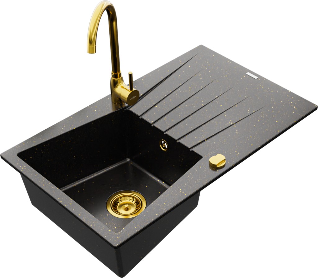 Technická data: dřez: Rozměr: 775x470x200mm Hloubka komory: 180 mm Rozměry komory: 410x355 mm Průměr odtoku: ø90 mm Typ: 1-miska s odkapávačem Typ: Zapuštěné do pracovní desky Barva: černá/zlatá metalíza Povrchová úprava sifonu: zlatá Materiál: žula (80 % žulové kamenivo, 20 % pryskyřice) Přepadový otvor: Ano Otvory: (baterie, automatické) 2 Instalace: Univerzální, lze instalovat s odkapávačem na levou nebo pravou stranu Vysoká odolnost proti poškrábání a změně barvy Odolnost proti tepelným šokům Snadno čistitelný povrch kuchyňská baterie: Materiál: mosaz Barva: Zlatá Hlava: Keramická Provzdušňovač: Ano Výška baterie: 335 mm Rozsah výtoku: 180 mm