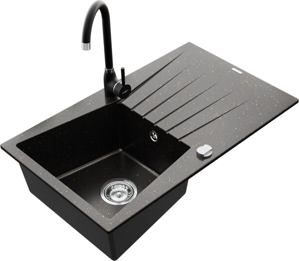 Technická data: dřez: Rozměr: 775x470x200mm Hloubka komory: 180 mm Rozměry komory: 410x355 mm Průměr odtoku: ø90 mm Typ: 1-miska s odkapávačem Typ: Zapuštěné do pracovní desky Barva: černá/zlatá metalíza Povrchová úprava sifonu: Chrome Materiál: žula (80 % žulové kamenivo, 20 % pryskyřice) Přepadový otvor: Ano Otvory: (baterie, automatické) 2 Instalace: Univerzální, lze instalovat s odkapávačem na levou nebo pravou stranu Vysoká odolnost proti poškrábání a změně barvy Odolnost proti tepelným šokům Snadno čistitelný povrch kuchyňská baterie: Materiál: mosaz Černá barva Hlava: Keramická Provzdušňovač: Ano Výška baterie: 335 mm Rozsah výtoku: 180 mm