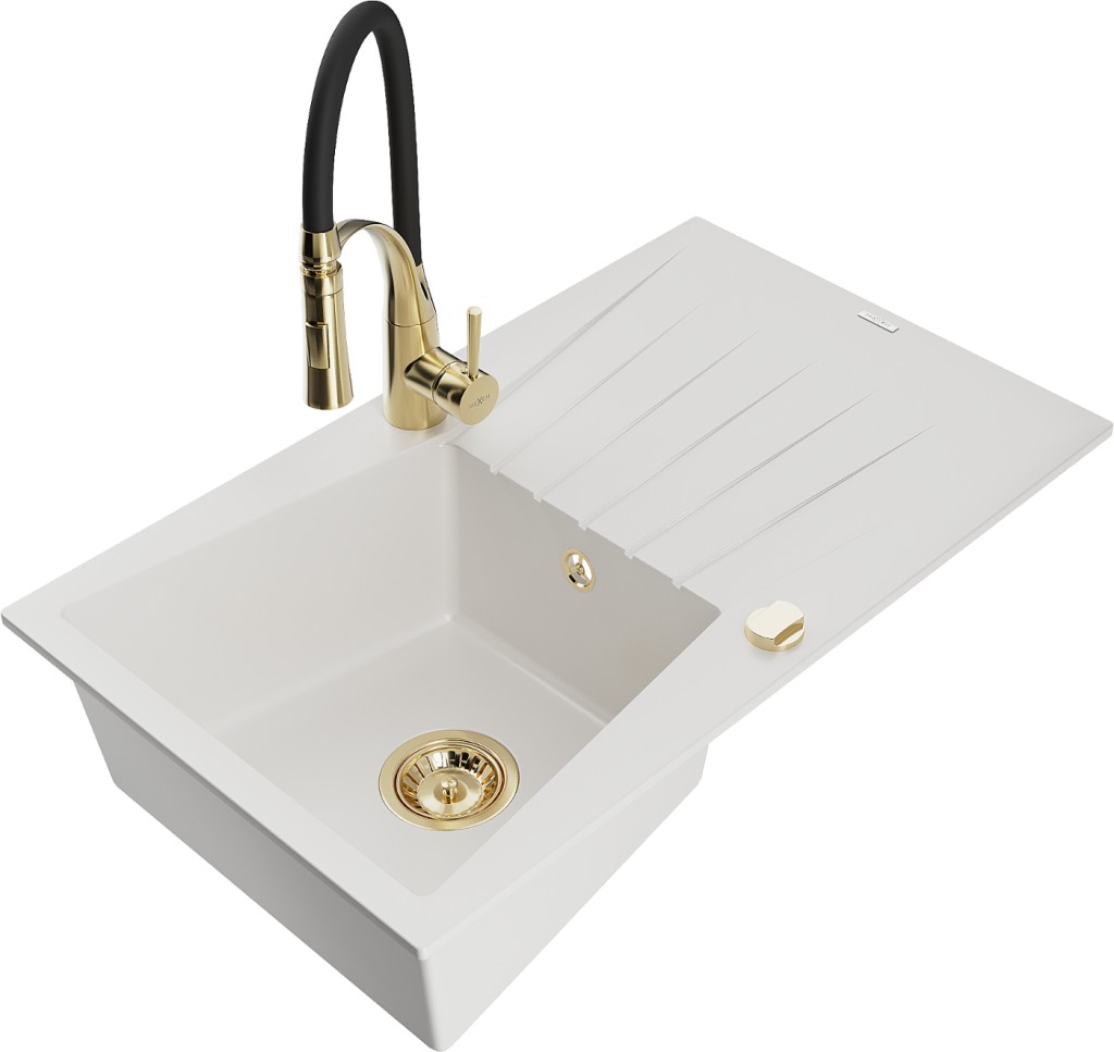 Technická data: dřez: Rozměr: 775x470x200mm Hloubka komory: 180 mm Rozměry komory: 410x355 mm Průměr odtoku: ø90 mm Typ: 1-miska s odkapávačem Typ: Zapuštěné do pracovní desky bílá barva Povrchová úprava sifonu: zlatá Materiál: žula (80 % žulové kamenivo, 20 % pryskyřice) Přepadový otvor: Ano Otvory: (baterie, automatické) 2 Instalace: Univerzální, lze instalovat s odkapávačem na levou nebo pravou stranu Vysoká odolnost proti poškrábání a změně barvy Odolnost proti tepelným šokům Snadno čistitelný povrch kuchyňská baterie: Materiál: mosaz Barva: Zlatá/Černá Hlava: Keramická Provzdušňovač: Ano Typ: Jedna páka Výška baterie: 430 mm Rozsah výtoku: 185 mm Baterie má výsuvný výtok