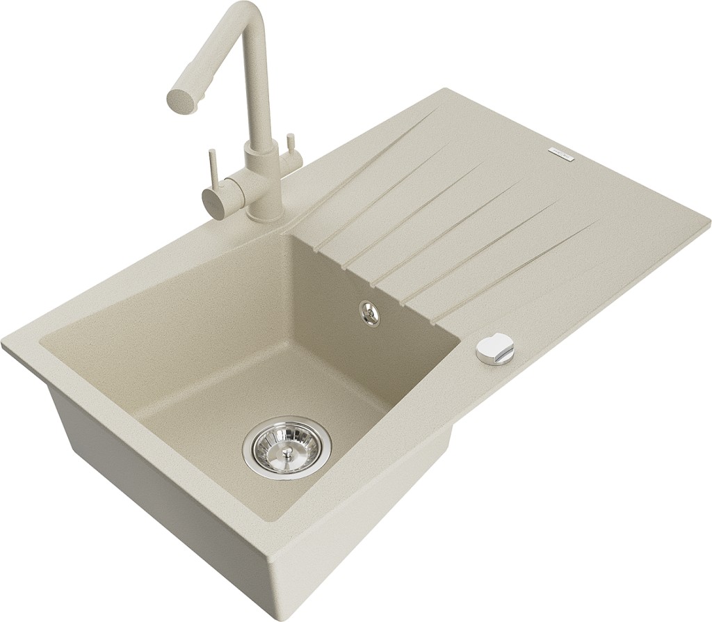 Technická data: dřez: Rozměr: 775x470x200mm Hloubka komory: 180 mm Rozměry komory: 410x355 mm Průměr odtoku: ø90 mm Typ: 1-miska s odkapávačem Typ: Zapuštěné do pracovní desky Barva béžová Povrchová úprava sifonu: Chrome Materiál: žula (80 % žulové kamenivo, 20 % pryskyřice) Přepadový otvor: Ano Otvory: (baterie, automatické) 2 Instalace: Univerzální, lze instalovat s odkapávačem na levou nebo pravou stranu Vysoká odolnost proti poškrábání a změně barvy Odolnost proti tepelným šokům Snadno čistitelný povrch kuchyňská baterie: Materiál: mosaz Barva béžová Hlava: Keramická Provzdušňovač: Ano Typ: Dvě rukojeti Rozsah výtoku: 235 mm Výška baterie: 315 mm Dvouhlavá baterie s přídavným kanálem pro filtrovanou pitnou vodu