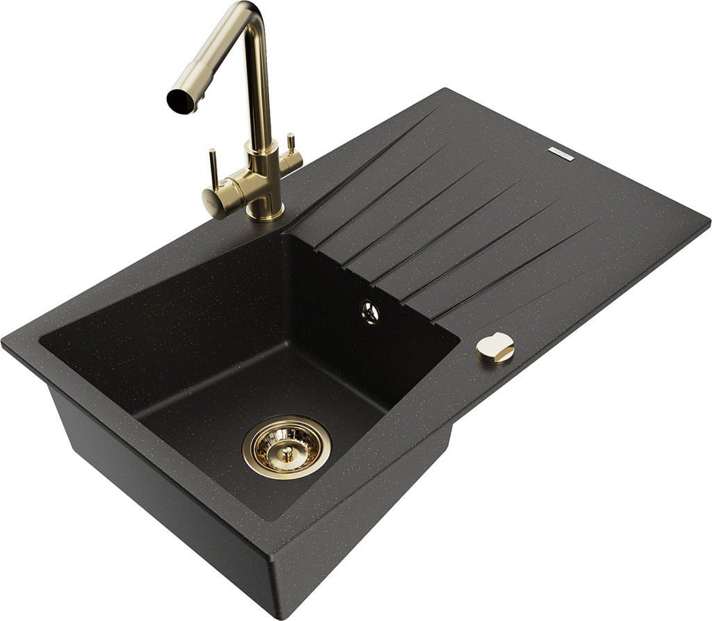 Technická data: dřez: Rozměr: 775x470x200mm Hloubka komory: 180 mm Rozměry komory: 410x355 mm Průměr odtoku: ø90 mm Typ: 1-miska s odkapávačem Typ: Zapuštěné do pracovní desky Barva: černá/zlatá metalíza Povrchová úprava sifonu: zlatá Materiál: žula (80 % žulové kamenivo, 20 % pryskyřice) Přepadový otvor: Ano Otvory: (baterie, automatické) 2 Instalace: Univerzální, lze instalovat s odkapávačem na levou nebo pravou stranu Vysoká odolnost proti poškrábání a změně barvy Odolnost proti tepelným šokům Snadno čistitelný povrch kuchyňská baterie: Materiál: mosaz Barva: Zlatá Hlava: Keramická Provzdušňovač: Ano Typ: Dvě rukojeti Rozsah výtoku: 235 mm Výška baterie: 315 mm Dvouhlavá baterie s přídavným kanálem pro filtrovanou pitnou vodu