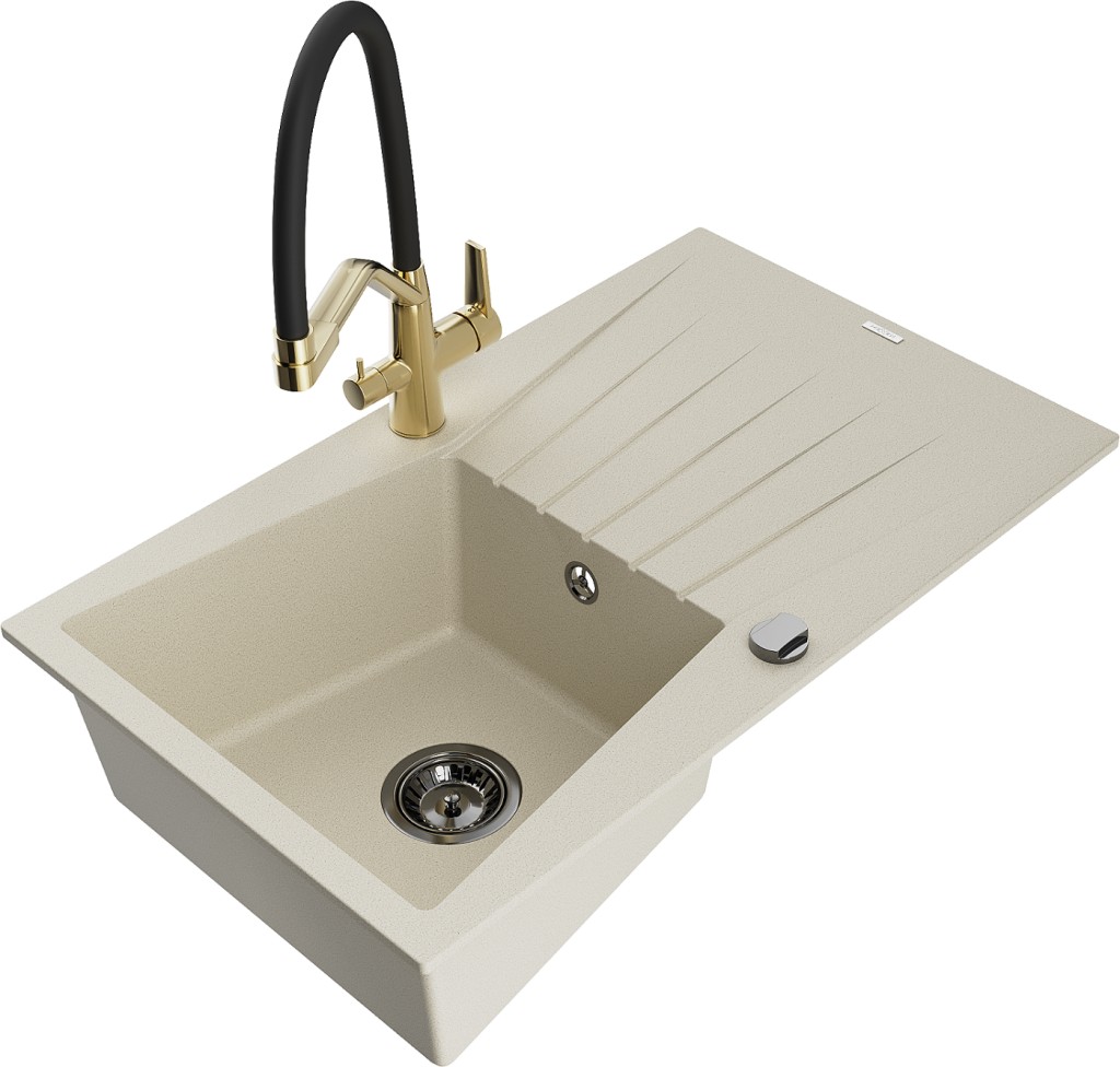 Technická data: dřez: Rozměr: 775x470x200mm Hloubka komory: 180 mm Rozměry komory: 410x355 mm Průměr odtoku: ø90 mm Typ: 1-miska s odkapávačem Typ: Zapuštěné do pracovní desky Barva béžová Povrchová úprava sifonu: černá Materiál: žula (80 % žulové kamenivo, 20 % pryskyřice) Přepadový otvor: Ano Otvory: (baterie, automatické) 2 Instalace: Univerzální, lze instalovat s odkapávačem na levou nebo pravou stranu Vysoká odolnost proti poškrábání a změně barvy Odolnost proti tepelným šokům Snadno čistitelný povrch kuchyňská baterie: Materiál: mosaz Barva: Zlatá/Černá Hlavy: Keramické Provzdušňovač: Ano Typ hubice: Flexibilní s mosazným držákem Rozsah výtoku: 260 mm Výška: 405 mm Typ: Dvě rukojeti Dvouhlavá baterie s přídavným filtrem na pitnou vodu