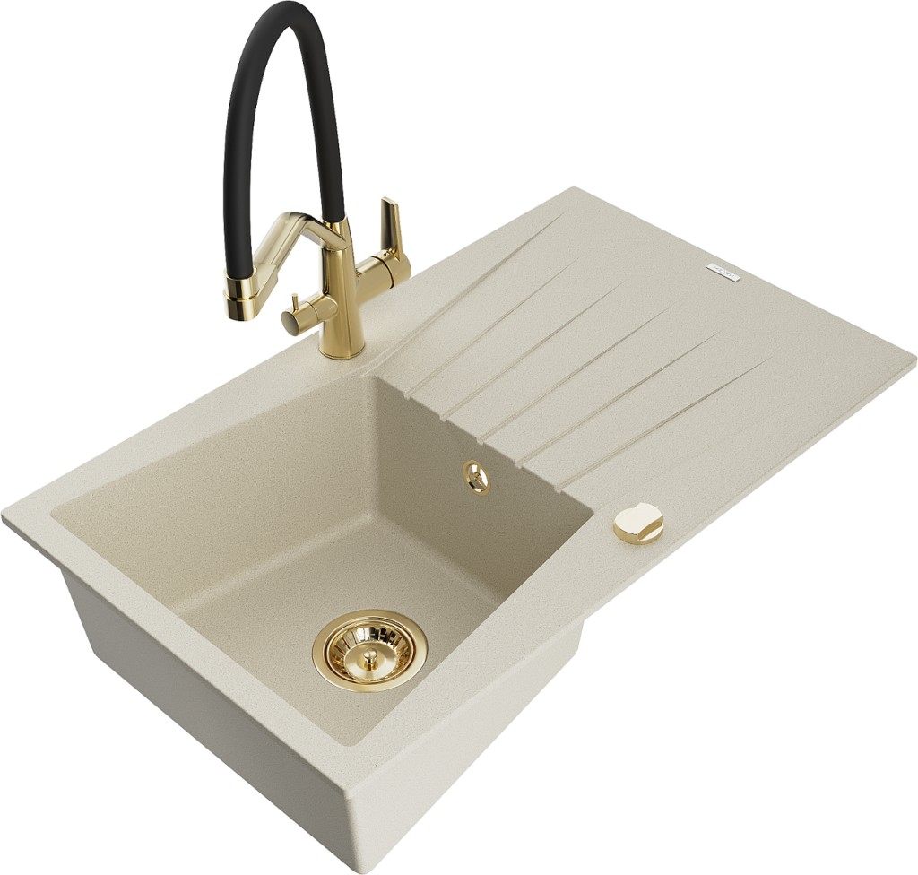 Technická data: dřez: Rozměr: 775x470x200mm Hloubka komory: 180 mm Rozměry komory: 410x355 mm Průměr odtoku: ø90 mm Typ: 1-miska s odkapávačem Typ: Zapuštěné do pracovní desky Barva béžová Povrchová úprava sifonu: zlatá Materiál: žula (80 % žulové kamenivo, 20 % pryskyřice) Přepadový otvor: Ano Otvory: (baterie, automatické) 2 Instalace: Univerzální, lze instalovat s odkapávačem na levou nebo pravou stranu Vysoká odolnost proti poškrábání a změně barvy Odolnost proti tepelným šokům Snadno čistitelný povrch kuchyňská baterie: Materiál: mosaz Barva: Zlatá/Černá Hlavy: Keramické Provzdušňovač: Ano Typ hubice: Flexibilní s mosazným držákem Rozsah výtoku: 260 mm Výška: 405 mm Typ: Dvě rukojeti Dvouhlavá baterie s přídavným filtrem na pitnou vodu