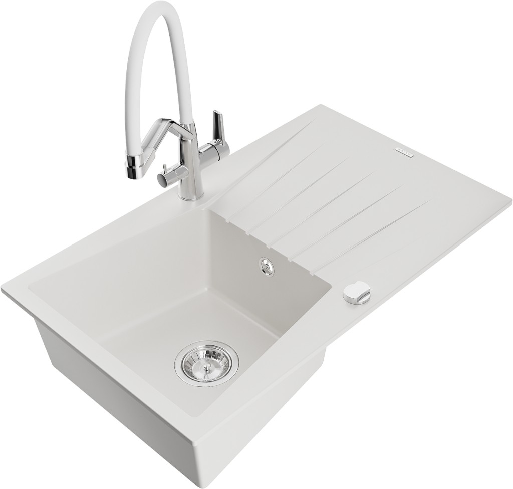Technická data: dřez: Rozměr: 775x470x200mm Hloubka komory: 180 mm Rozměry komory: 410x355 mm Průměr odtoku: ø90 mm Typ: 1-miska s odkapávačem Typ: Zapuštěné do pracovní desky bílá barva Povrchová úprava sifonu: Chrome Materiál: žula (80 % žulové kamenivo, 20 % pryskyřice) Přepadový otvor: Ano Otvory: (baterie, automatické) 2 Instalace: Univerzální, lze instalovat s odkapávačem na levou nebo pravou stranu Vysoká odolnost proti poškrábání a změně barvy Odolnost proti tepelným šokům Snadno čistitelný povrch kuchyňská baterie: Materiál: mosaz Barva: chrom/bílá Hlavy: Keramické Provzdušňovač: Ano Typ hubice: Flexibilní s mosazným držákem Rozsah výtoku: 260 mm Výška: 405 mm Typ: Dvě rukojeti Dvouhlavá baterie s přídavným filtrem na pitnou vodu
