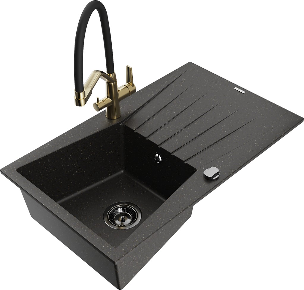 Technická data: dřez: Rozměr: 775x470x200mm Hloubka komory: 180 mm Rozměry komory: 410x355 mm Průměr odtoku: ø90 mm Typ: 1-miska s odkapávačem Typ: Zapuštěné do pracovní desky Barva: černá/zlatá metalíza Povrchová úprava sifonu: černá Materiál: žula (80 % žulové kamenivo, 20 % pryskyřice) Přepadový otvor: Ano Otvory: (baterie, automatické) 2 Instalace: Univerzální, lze instalovat s odkapávačem na levou nebo pravou stranu Vysoká odolnost proti poškrábání a změně barvy Odolnost proti tepelným šokům Snadno čistitelný povrch kuchyňská baterie: Materiál: mosaz Barva: Zlatá/Černá Hlavy: Keramické Provzdušňovač: Ano Typ hubice: Flexibilní s mosazným držákem Rozsah výtoku: 260 mm Výška: 405 mm Typ: Dvě rukojeti Dvouhlavá baterie s přídavným filtrem na pitnou vodu